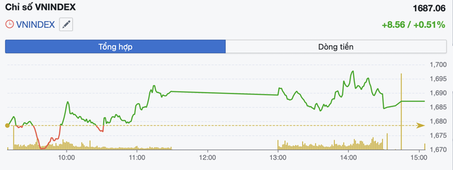 Bước sang phiên chiều, thị trường xuất hiện một vài nhịp rung lắc nhưng xu hướng chung vẫn tích cực. Dòng tiền mua vào tăng tốc, giúp VN-Index có lúc chạm mốc 1.697 điểm trước khi kết phiên tại 1.687,06 điểm, tăng 8,56 điểm (+0,51%) so với hôm qua.
