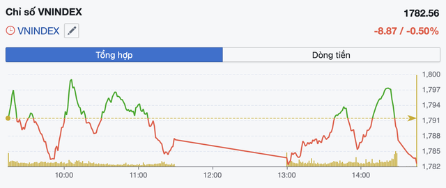 Bước sang phiên chiều, áp lực điều chỉnh tiếp tục gia tăng. VN-Index có thời điểm lùi sát vùng 1.782 điểm trước khi xuất hiện một số nhịp hồi nhờ lực mua ở nhóm cổ phiếu trụ. Tuy nhiên, nỗ lực nâng đỡ không đủ mạnh để giúp thị trường đảo chiều. Chốt phiên, VN-Index giảm 8,87 điểm, tương đương 0,5%, xuống còn 1.782,56 điểm.