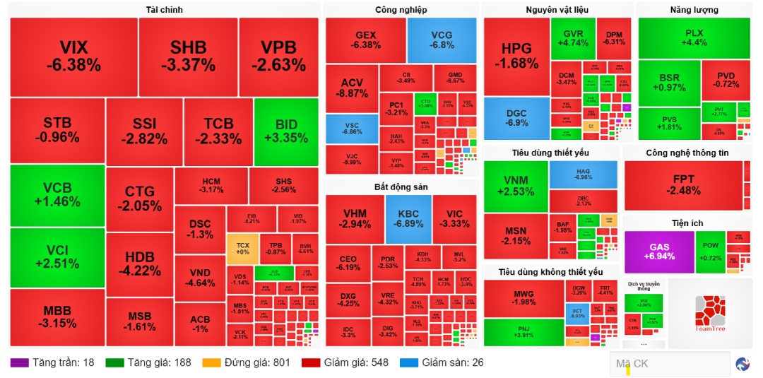 Tâm lý thị trường cũng bi quan khi số cổ phiếu giảm vượt trội so với số cổ phiếu tăng. Trên sàn HOSE có đến 264 mã giảm trong khi chỉ có 73 mã tăng, 45 mã giữ tham chiếu. Tương tự, sàn HNX ghi nhận 120 mã giảm điểm, trong khi chỉ có 36 mã tăng. Có đến 18 mã cổ phiếu “nằm sàn” trong khi số mã tăng trần là 7, trên cả hai sàn giao dịch.