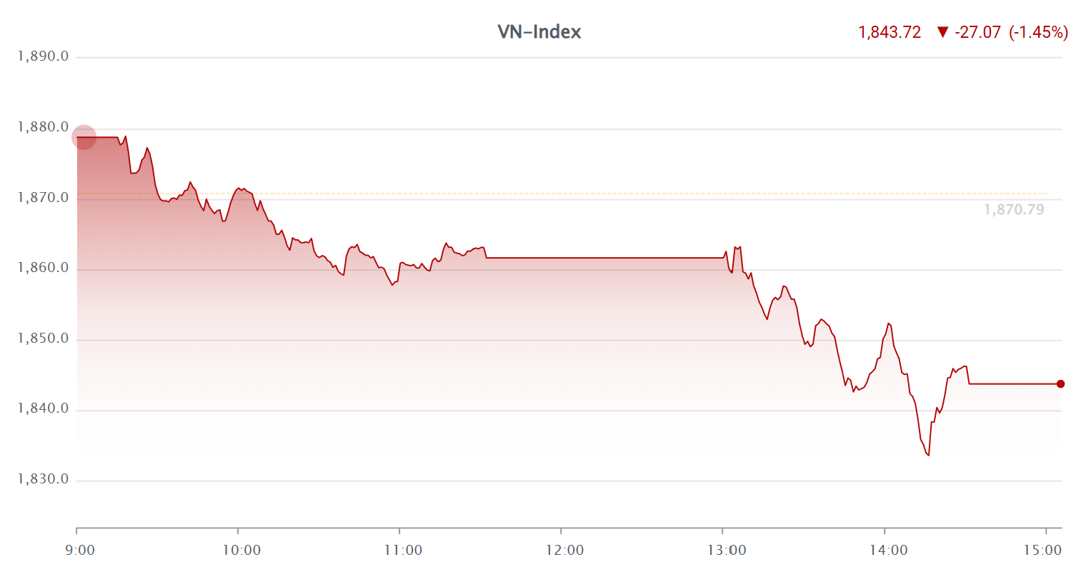 Biên độ dao động của chỉ số VN-Index lên đến 46 điểm, nhưng kết phiên thu hẹp đà giảm còn 27,07 điểm. Chỉ số chính của thị trường chứng khoán tương ứng giảm 1,45%, về mức 1.843,72 điểm, xác lập mạch giảm điểm 5 phiên liên tiếp. Chỉ số HNX-Index cũng giảm 2,4%.
