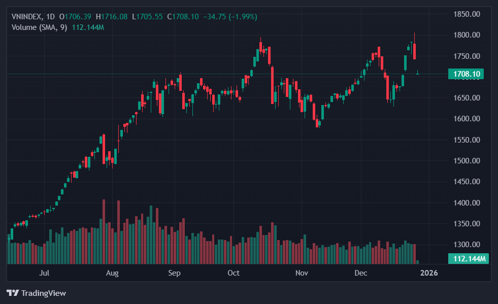 Sau phiên lao dốc gần 40 điểm hôm qua, thị trường chứng khoán Việt Nam bước vào phiên 26/12 với tâm lý tiêu cực. Ngay từ phiên xác định giá mở cửa (ATO), chỉ số chính VN-Index đã giảm xấp xỉ 40 điểm trước sức ép bán tháo của nhóm cổ phiếu vốn hóa lớn VN30, đặc biệt là 3 mã “họ Vin” gồm VIC, VHM và VRE.