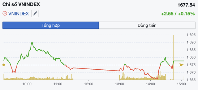 Đóng cửa, VN-Index tăng 2,55 điểm (+0,15%), lên mức 1.675,48 điểm. Độ rộng thị trường cải thiện so với phiên sáng với 161 mã tăng và 140 mã giảm trên sàn HoSE.