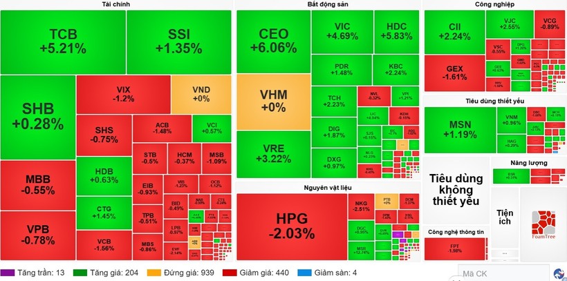 Nhóm bất động sản là lực đỡ chính của thị trường. Cổ phiếu CEO tăng mạnh +6,06%, VIC +4,74%, VRE 3,35%, TCH +2,83%. Tâm lý nhà đầu tư được hỗ trợ bởi kỳ vọng giảm lãi suất huy động và chính sách tháo gỡ pháp lý đang được đẩy nhanh.