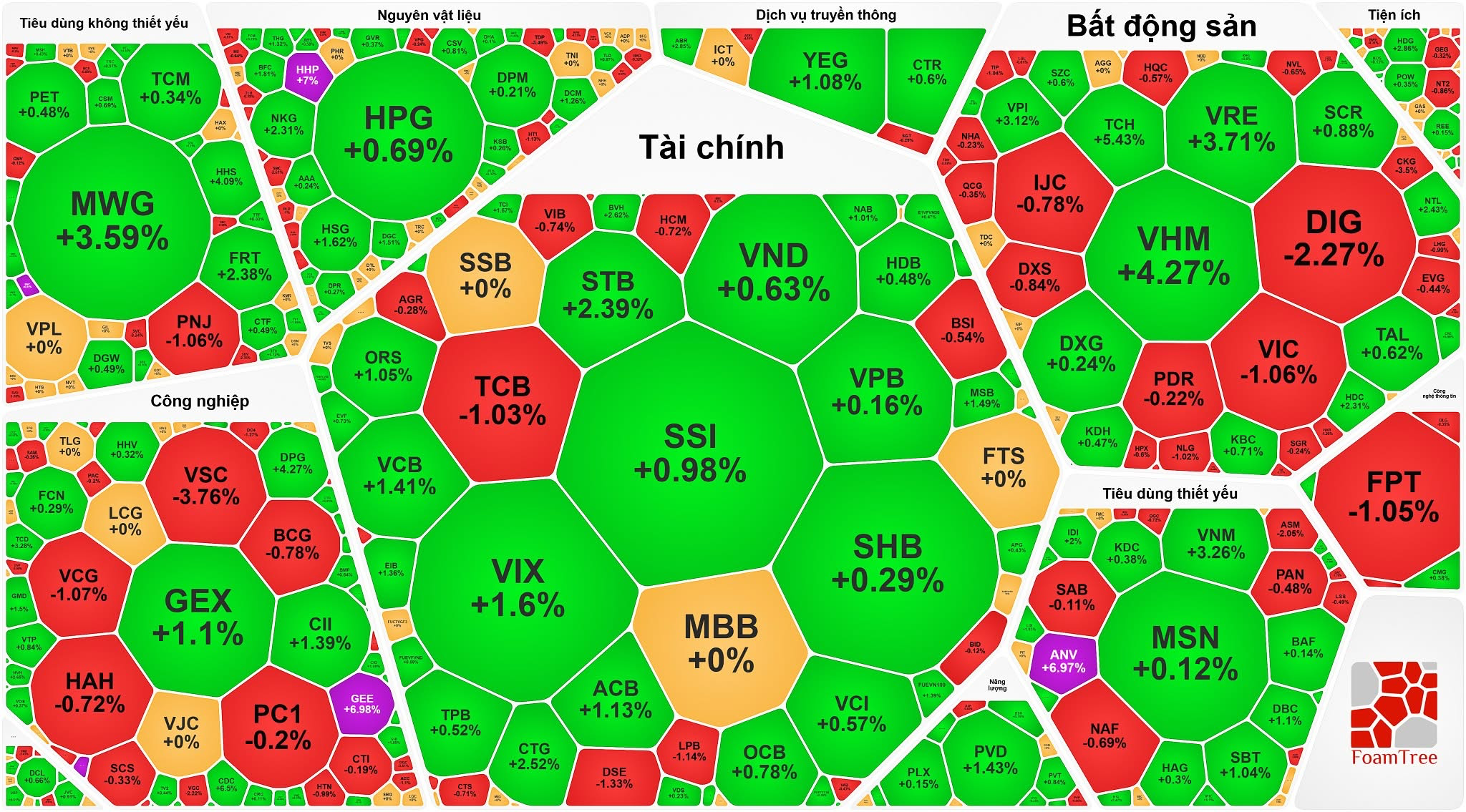 Ngoài ra, nhóm cổ phiếu tiêu dùng, đầu tư công, thép cũng giao dịch tích cực trở lại, nhiều cổ phiếu tăng mạnh: ANV tăng trần, VNM tăng 3,26%, MWG tăng 2,59%; DPG tăng 4,27%, CII tăng 1,39%; NKG tăng 2,31%, HSG tăng 1,42%...