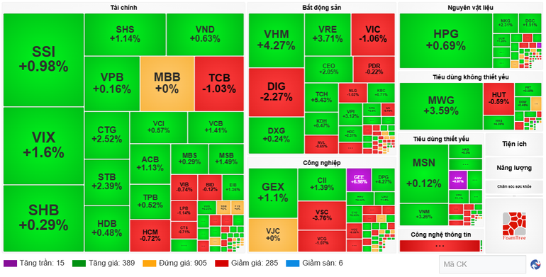 Nhóm cổ phiếu bất động sản phiên này ghi nhận mức tăng 0,92%, chủ yếu từ các mã VHM, VRE, BCM, KDH, KBC, KSF, DXG, VPI, TAL, TCH… Chiều ngược lại, các mã giảm gồm VIC, SSH, NVL, PDR, NLG, IDC, DIG, SNZ, DXS…