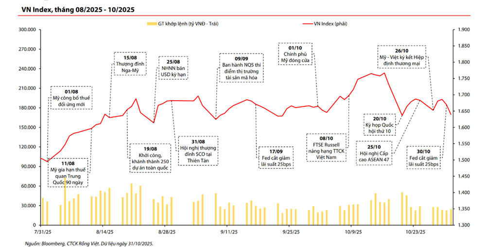 Tại Báo cáo của Chứng khoán Rồng Việt vừa công bố, kết thúc phiên giao dịch ngày 31/10, VN-Index đóng cửa ở mức 1.639,6 điểm, tăng 9,1% so với quý trước (QoQ) và chính thức thiết lập đỉnh lịch sử mới. Thanh khoản thị trường bùng nổ khi giá trị khớp lệnh (GTKL) bình quân trên sàn HoSE đạt 38.910 tỷ đồng/phiên, tăng 61,8% QoQ, phản ánh dòng tiền trong nước quay trở lại mạnh mẽ và chấp nhận vùng định giá cao hơn.