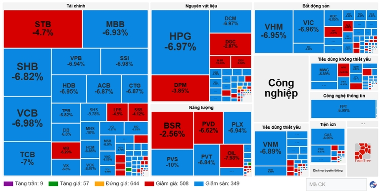 Trong một phiên giảm điểm lịch sử không có nhóm ngành nào giữ được sắc xanh, tất cả đều chìm trong sắc đỏ, thậm chí là giảm sâu. Dầu khí (-14,73%) là nhóm được hưởng lợi khi giá dầu tăng nhưng cũng quay đầu điều chỉnh, trở thành nhóm giảm sâu nhất thị trường. Nhiều nhóm giảm lên đến 2 chữ số trong phiên hôm nay như: Bất động sản Khu công nghiệp (-14,22%), Bán lẻ (-12,9%), Chứng khoán (-12,51%), Thực phẩm tiêu dùng (-11,79%)…