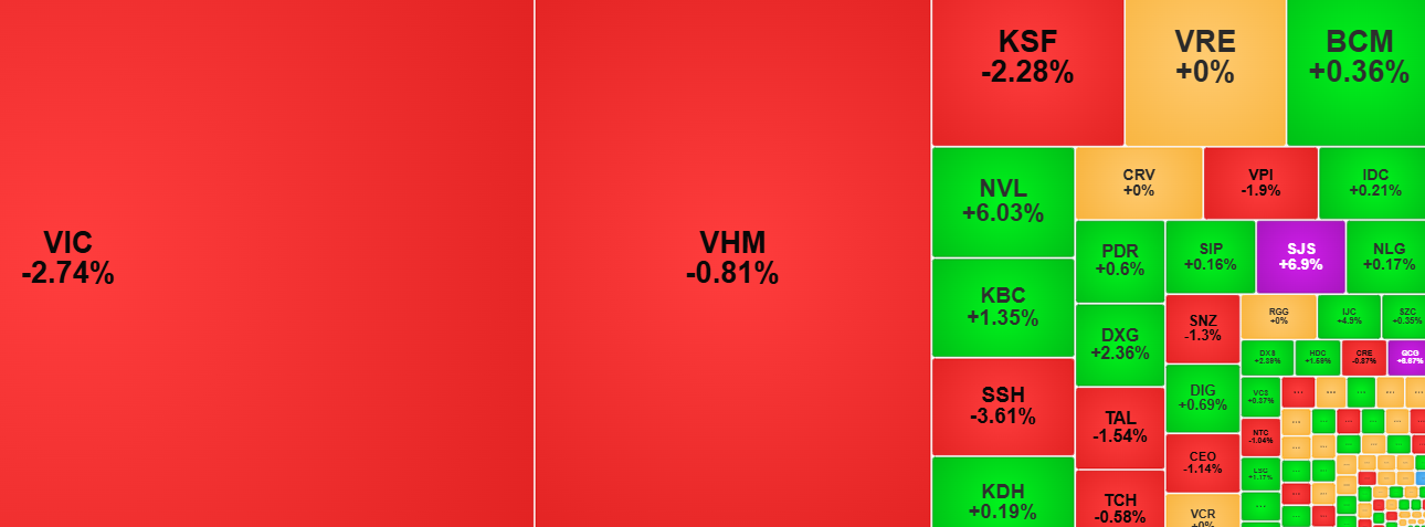 Nếu như phiên trước, VIC – mã vốn hóa lớn nhất thị trường – hỗ trợ tích cực cho VN-Index, thì hôm nay lại tác động tiêu cực nhất, lấy đi 6,82 điểm. Ngoài VIC, cổ phiếu nhà Vingroup gồm VPL, VHM cũng gây áp lực, lần lượt làm giảm 1,82 điểm và 0,88 điểm.