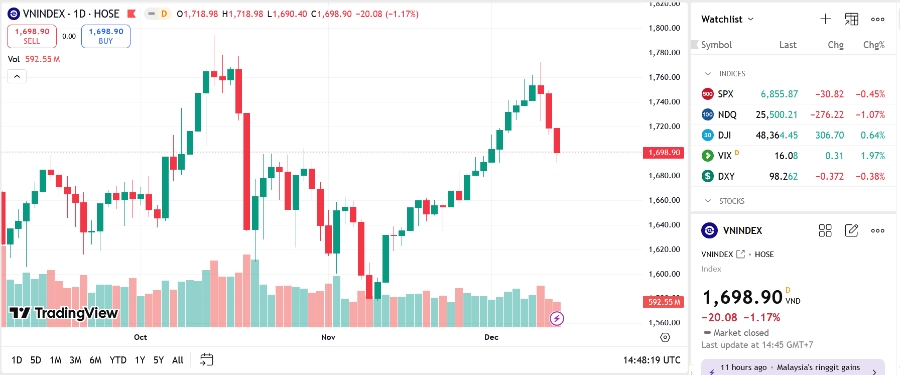 Kết phiên 11/12 VN-Index giảm 20,08 điểm, tương đương 1,17% xuống mốc 1.698,9 điểm. Cùng chiều, Hnx-Index giảm 0,61 điểm, tương đương 0,24% xuống 255,87 điểm.
