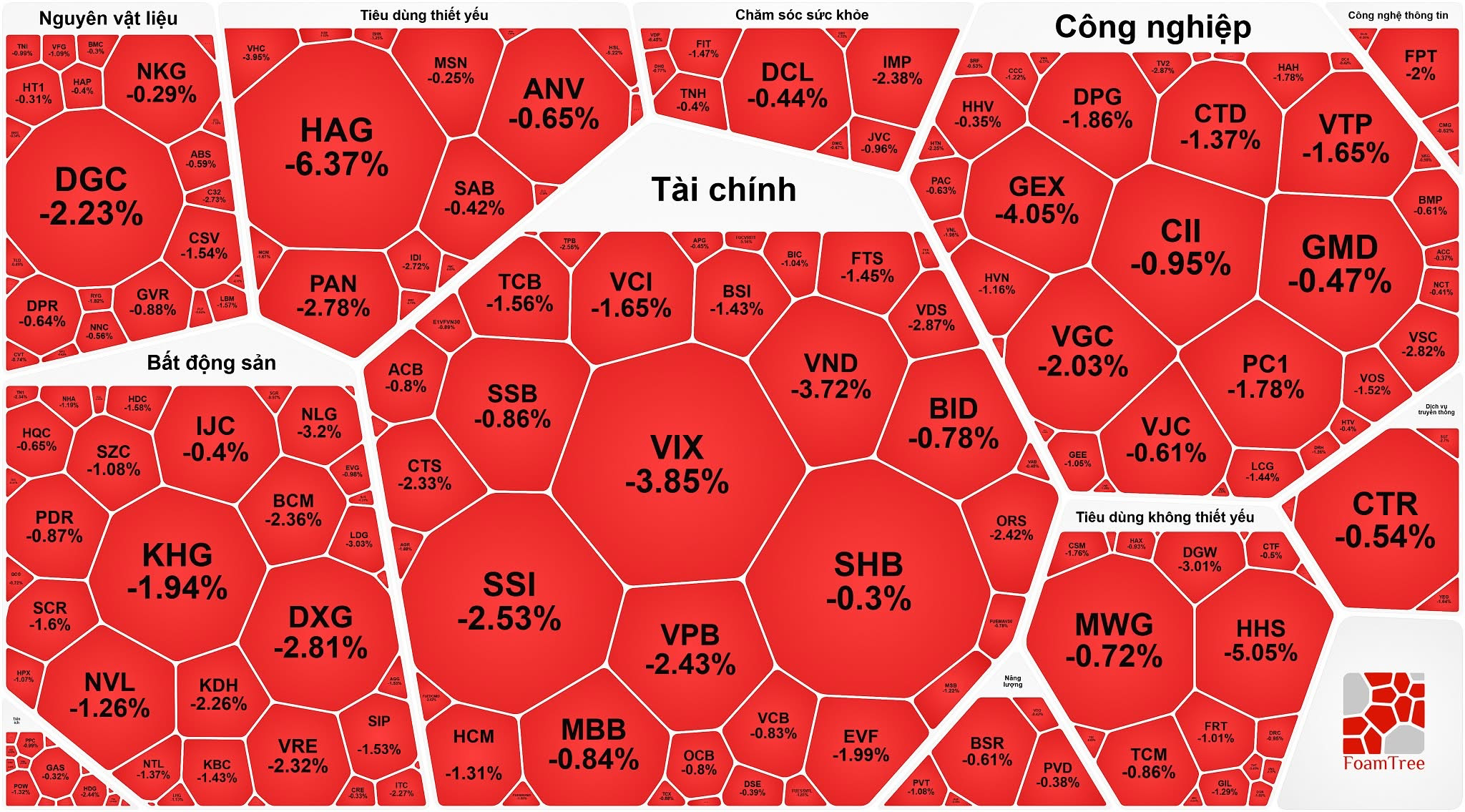 Ngoài ra, nhóm cổ phiếu công nghiệp, tiêu dùng cũng giảm, trong đó nhiều cổ phiếu giảm mạnh: HAG giảm 6,37%, DGW giảm 3,01%, VHC giảm 3,95%, GEX giảm 4,05%, VSC giảm 2,82%...