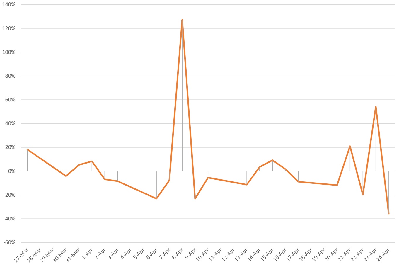 Tốc độ tăng trưởng giá trị khớp lệnh trên sàn HOSE trong một tháng qua. Nguồn: Vietstock.