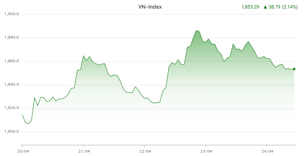 Trong buổi sáng phiên giao dịch hôm 24-4, thị trường đã kém tích cực khi sắc đỏ chiếm ưu thế, đi kèm thanh khoản suy giảm rõ rệt và áp lực bán ròng từ khối ngoại gia tăng. Đến buổi chiều, đà điều chỉnh trở nên mạnh hơn khi các cổ phiếu trụ suy yếu, kéo chỉ số giảm sâu. Độ rộng thị trường nghiêng về bên bán với 188 mã giảm, 135 mã tăng và 55 mã tham chiếu.