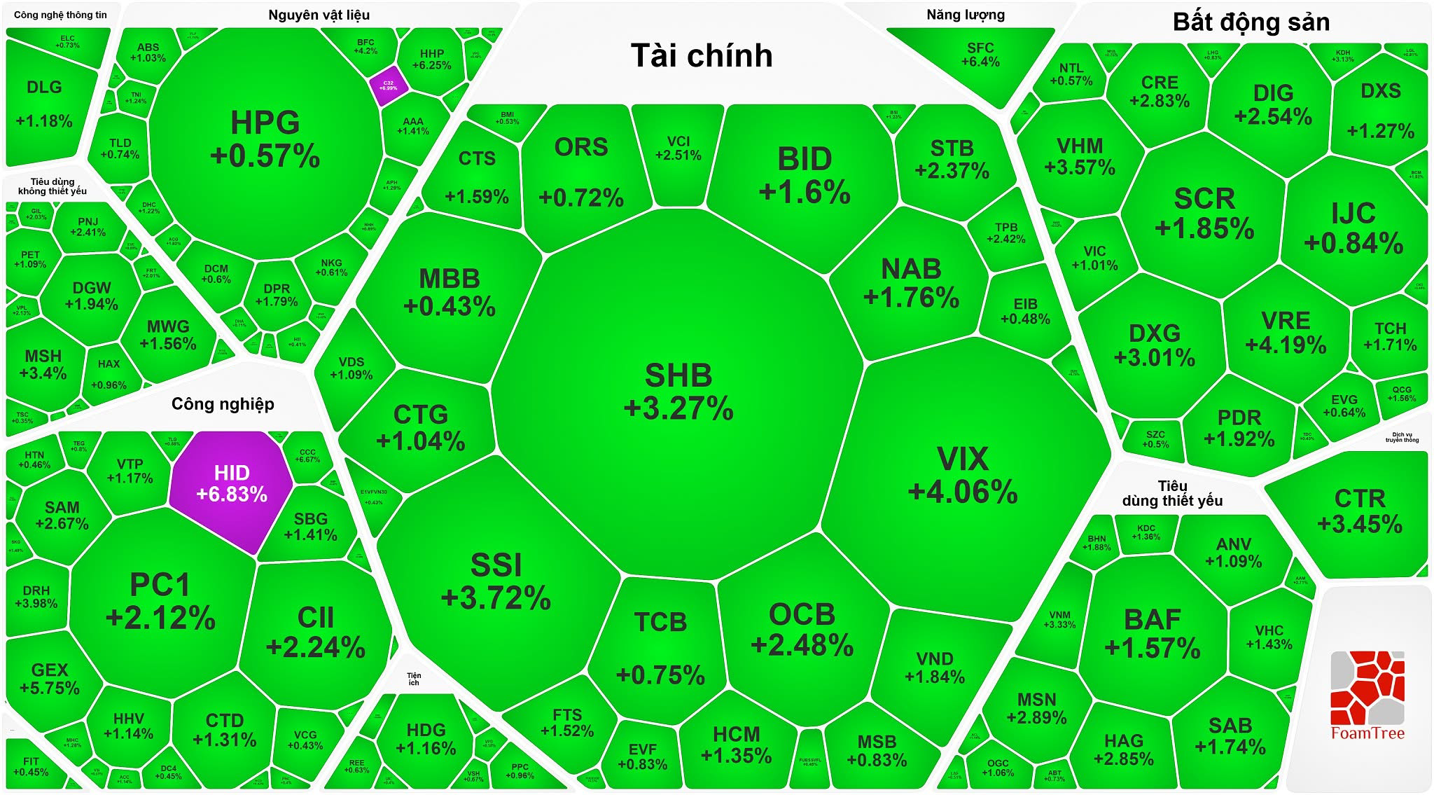 Ngoài ra, nhóm cổ phiếu công nghiệp, tiêu dùng cũng giao dịch tích cực, nhiều cổ phiếu tăng mạnh như: HID tăng trần, GEX tăng 5,75%, VGR tăng 3,54%; VNM tăng 3,33%, MSN tăng 2,89%, MWG tăng 1,56%...