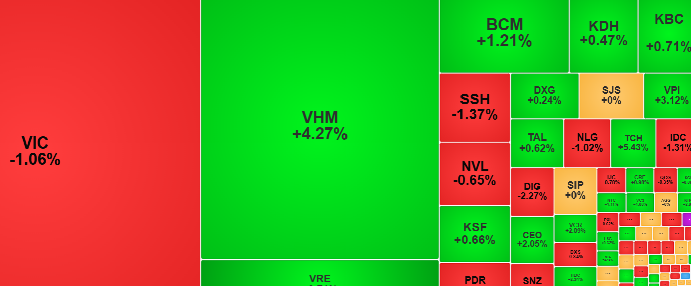 Cổ phiếu có sự phân hóa đáng kể, đặc biệt là nhóm vốn hóa lớn. Trong nhóm bất động sản, VHM đóng góp nhiều điểm nhất vào chỉ số VN-Index với 4,32 điểm trong khi VIC lại lấy đi nhiều điểm nhất với 1,68 điểm. Ở nhóm ngân hàng, VCB, CTG, STB, ACB nằm trong nhóm đóng góp tích cực nhất; ngược lại, TCB, LPB, BID, VIB thuộc nhóm có tác động tiêu cực.