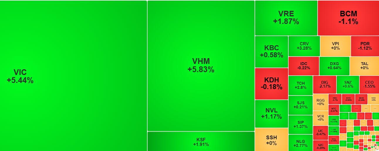 Thị trường tăng điểm nhờ lực đỡ mạnh từ nhóm cổ phiếu họ Vin. VIC đóng góp 14,06 điểm, VHM đóng góp 5,48 điểm. Riêng hai mã này đã đóng góp nhiều hơn tổng số điểm tăng của VN-Index trong phiên. Ngoài ra, VRE cũng cộng thêm 0,27 điểm vào chỉ số.