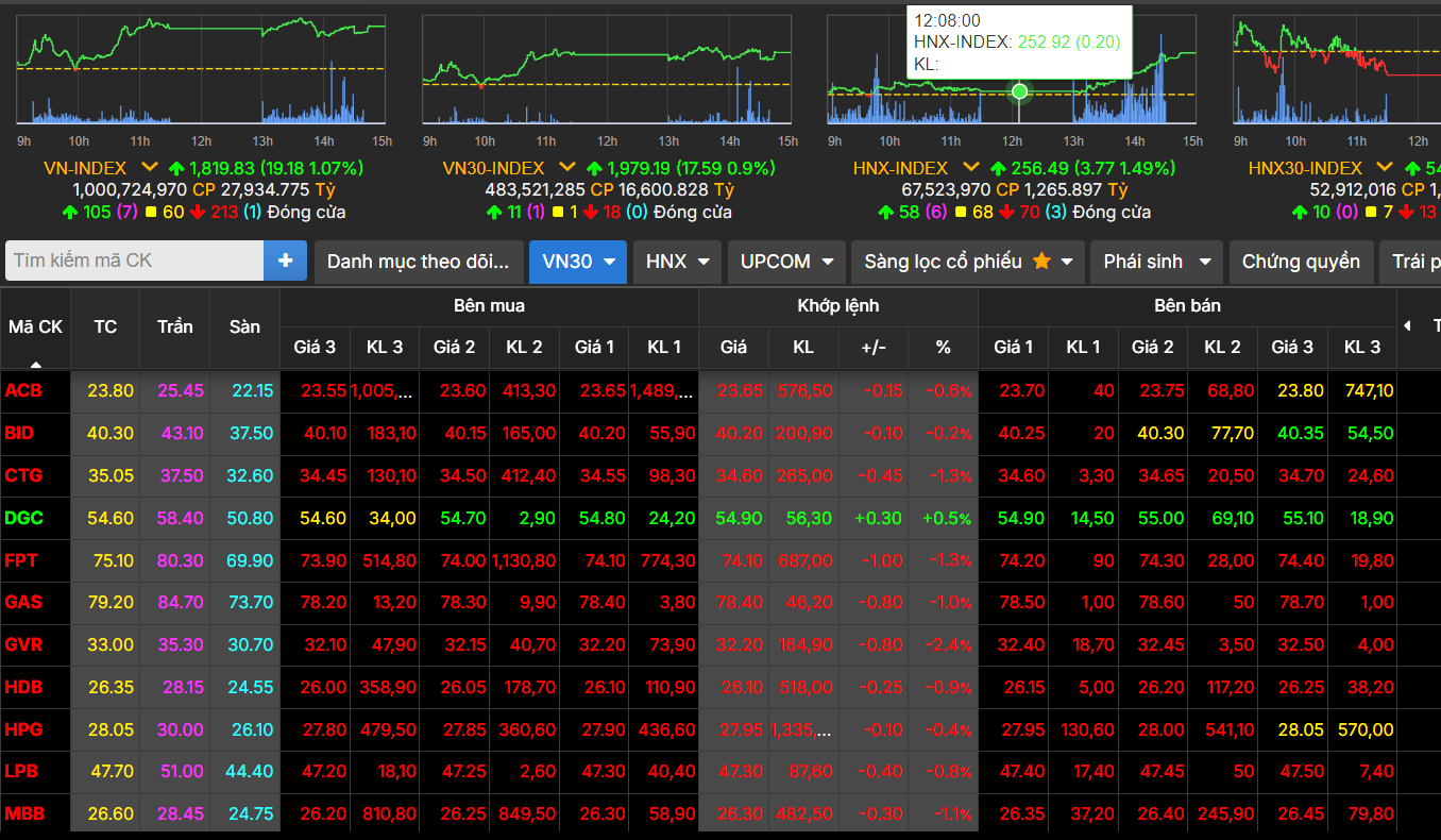 Trên sàn thành phố Hồ Chí Minh, VN-Index chỉ xuất hiện sắc đỏ trong ít giây phiên sáng, thời gian còn lại duy trì đà đi lên.