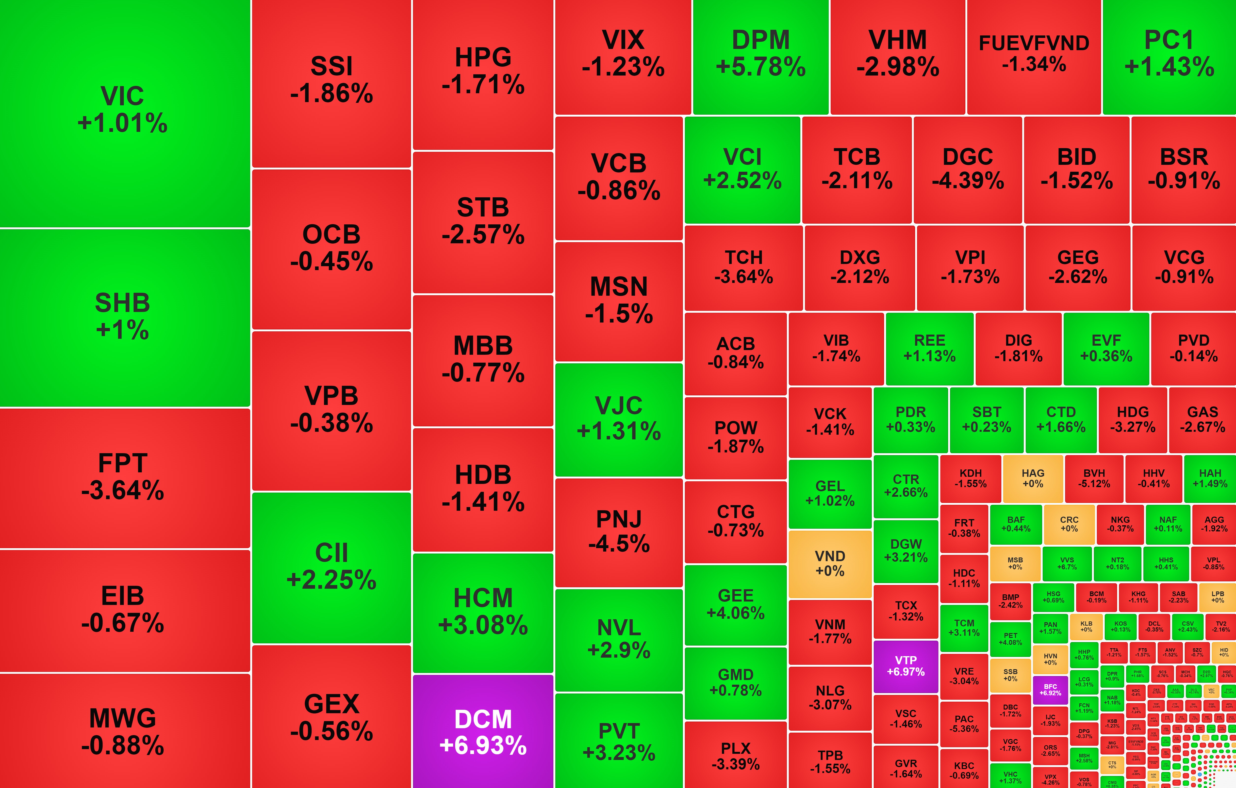 Nhóm bán lẻ có PNJ giảm mạnh 4,5%, MSN giảm 1,5%, MWG giảm 0,9%; trong khi DGW tăng 3,2%, PET tăng hơn 4%.