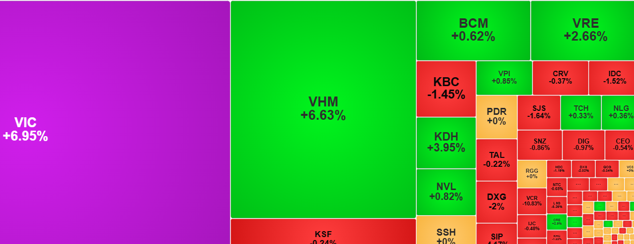 Ở chiều ngược lại, với diễn biến tích cực từ cổ phiếu nhà VIC nên nhóm bất động sản tăng 4,72%, cao nhất thị trường; kế đến là nhóm dịch vụ tiêu dùng. Các nhóm ngành khác như chứng khoán, thiết bị và dịch vụ chăm sóc sức khỏe, truyền thông và giải trí, thương mại hàng thiết yếu, dịch vụ thương mại và chuyên nghiệp tăng dưới 1%.