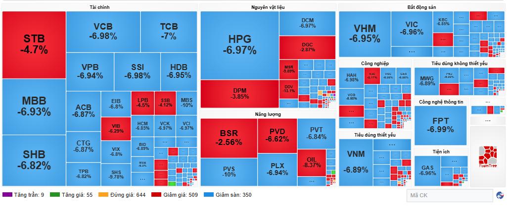 Các nhóm ngành lớn như tài chính, bất động sản, nguyên vật liệu và tổ chức tín dụng đều giảm quanh mức 6 - 7%.