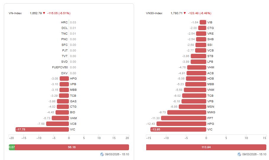 Kết thúc phiên giao dịch chiều 9/3, VN-Index đóng cửa ở mức 1.652,79 điểm, giảm 115,05 điểm, tương đương 6,51%. HNX-Index giảm 18,28 điểm (7,21%) xuống 235,36 điểm, còn UPCoM-Index giảm 7,5 điểm (5,91%) xuống 119,35 điểm.