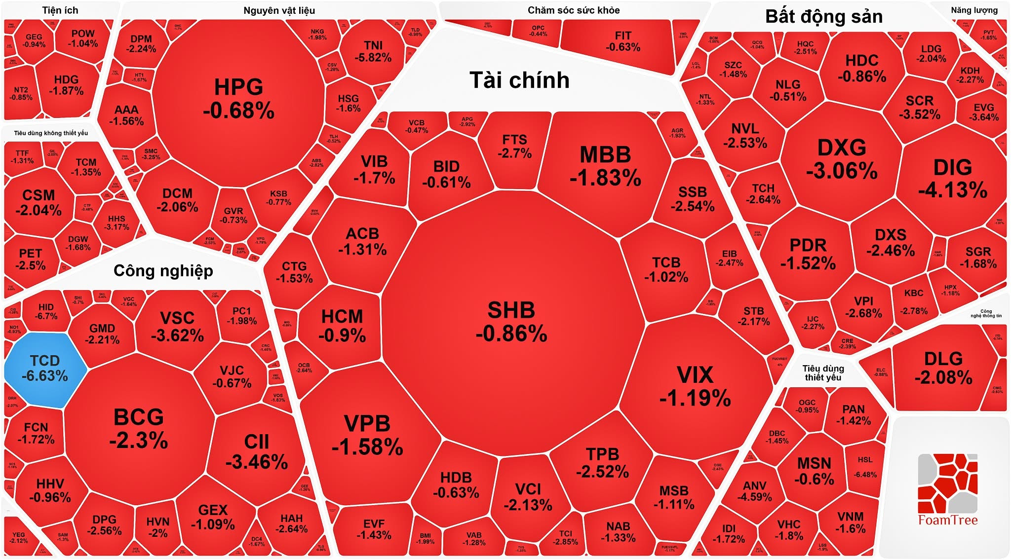 Nhóm cổ phiếu bất động sản và đầu tư công giảm khá sâu: DIG giảm 4,13%, CEO giảm 3,94%, NVL giảm 2,78%, KBC giảm 2,78%, KDH giảm 2,27%, TCH giảm 2,64%, SCR giảm 3,52%, CII giảm 3,46%, VSC giảm 3,62%, DPG giảm 2,56%...