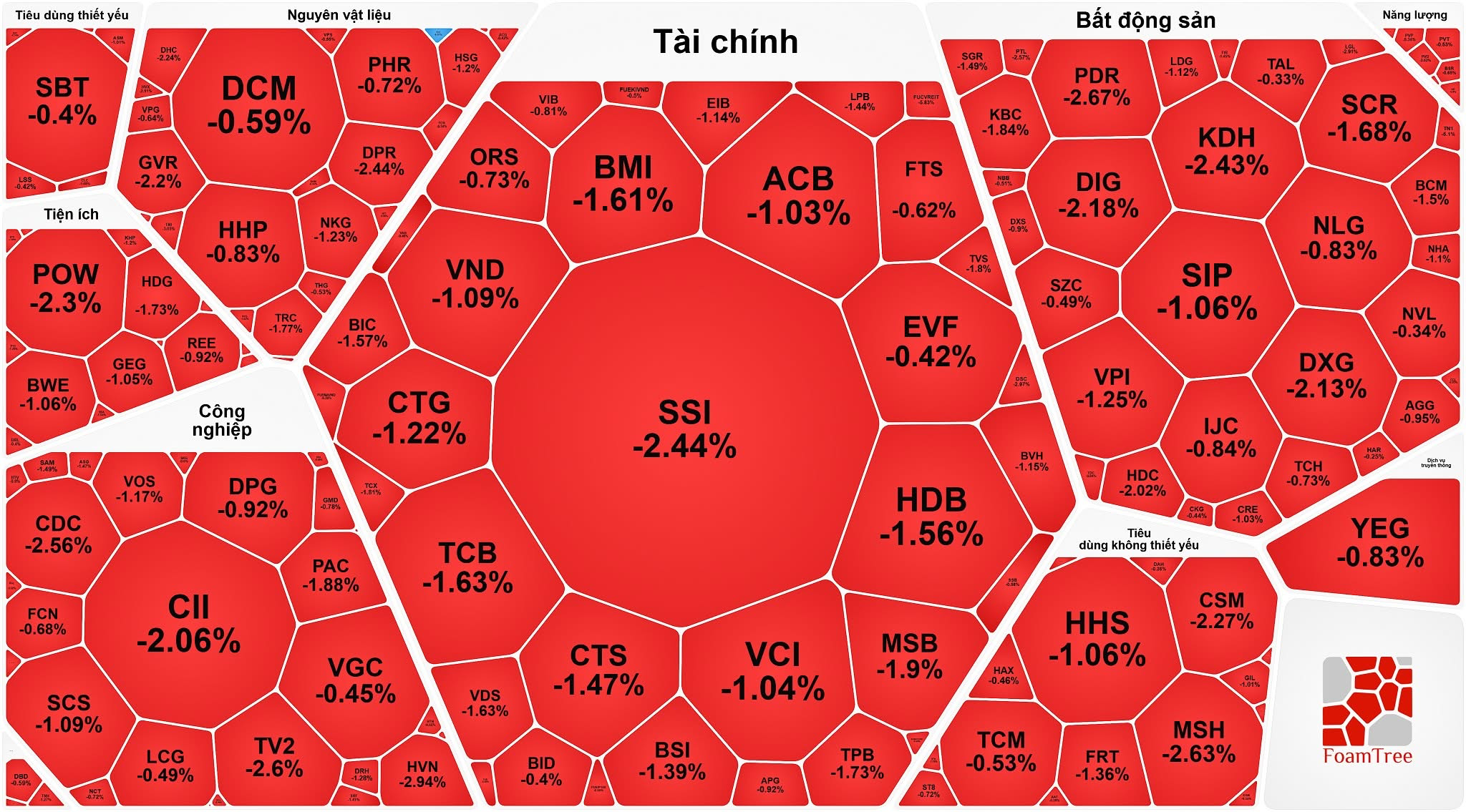 Trong khi đó, hầu hết nhóm cổ phiếu chính trên thị trường như ngân hàng, chứng khoán, bất động sản, dầu khí, thép… đều ngập sắc đỏ; đồng loạt giảm từ 1 đến gần 3%.
