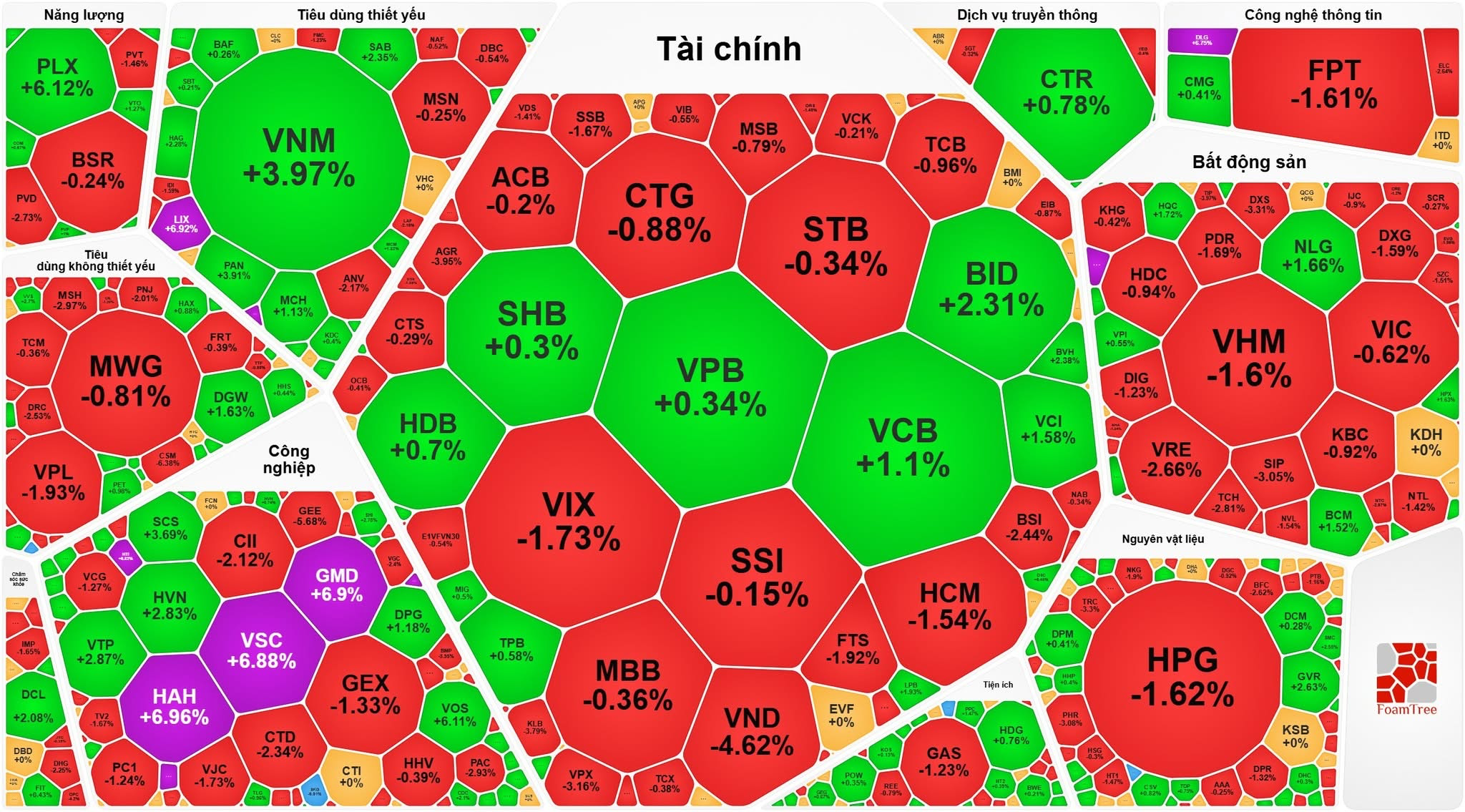 Nhóm cổ phiếu ngân hàng diễn biến phân hóa. Một số mã tăng điểm như BID tăng 2,31%, VCB tăng 1,1%, LPB tăng 1,92%; SHB, HDB, VPB, TPB tăng gần 1%. Ngược lại, CTG, MBB, ACB, TCB, VIB, STB, EIB, OCB giảm gần 1%.