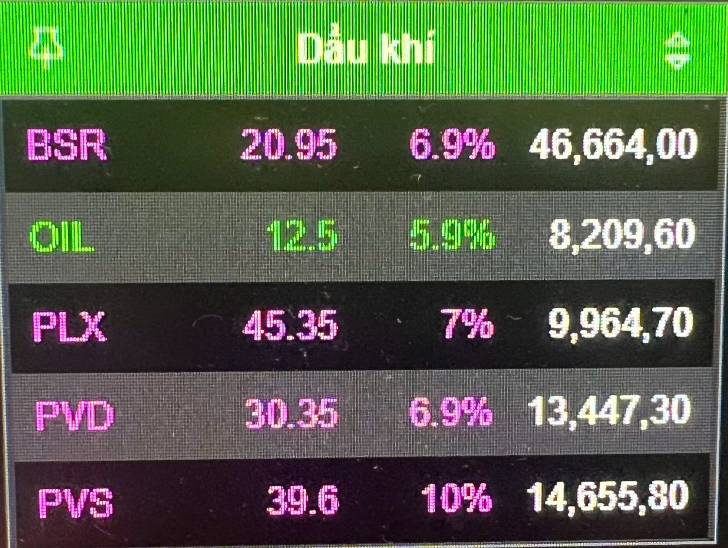 Tâm điểm của thị trường là sự bứt phá mạnh mẽ của nhóm cổ phiếu năng lượng, dầu khí. Hàng loạt cổ phiếu trụ cột nhóm này đồng loạt tăng kịch trần. Trong đó, GAS bứt phá 6,91% để chạm mức giá kỷ lục 103.700 đồng/cổ phiếu. Cùng chung xu hướng đó, các mã PVD, BSR, PVT, PVS cũng đồng loạt tăng hết biên độ. Sắc xanh lan tỏa rộng khắp khi PVB tăng đến 8,5%, trong khi OIL, NT2, CNG và POW cũng duy trì đà tăng trưởng tích cực từ 3% đến hơn 6%.