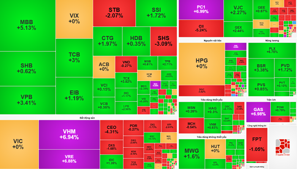 Tâm điểm của phiên giao dịch thuộc về nhóm bất động sản, đặc biệt là các cổ phiếu liên quan đến hệ sinh thái Vingroup. VHM và VRE cùng tăng trần, trở thành động lực quan trọng thúc đẩy VN-Index. VIC đóng cửa tại tham chiếu nhưng vẫn đóng vai trò giữ nhịp cho thị trường.