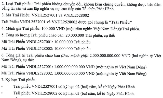 Cụ thể, trái phiếu VNDL2527001 có kỳ hạn 2 năm, phát hành 10 triệu trái phiếu với lãi suất cố định 8%/năm cho kỳ tính lãi đầu tiên, sau đó thả nổi bằng lãi suất tham chiếu cộng biên độ 2,8%/năm.