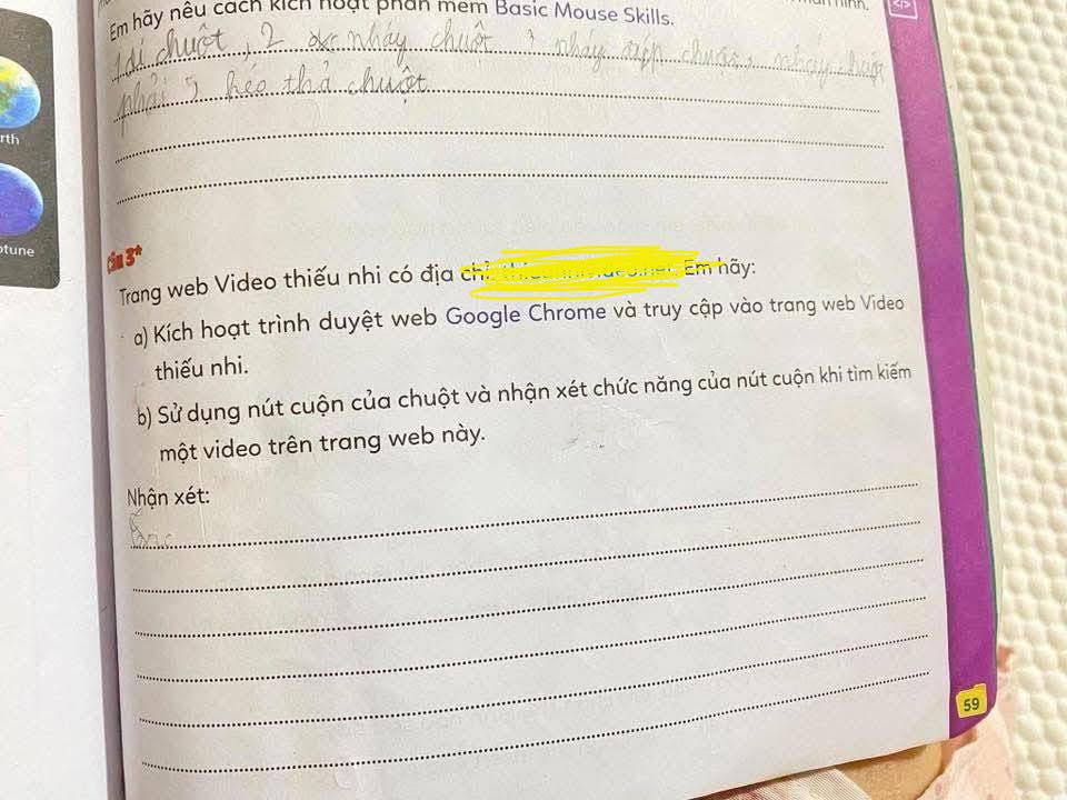 Theo đó, tại trang 59 của cuốn sách, bài tập yêu cầu học sinh dùng trình duyệt Google Chrome truy cập vào một địa chỉ website để tập sử dụng nút cuộn chuột. Tuy nhiên, truy cập vào website này dẫn đến một địa chỉ có nội dung “không lành mạnh”.