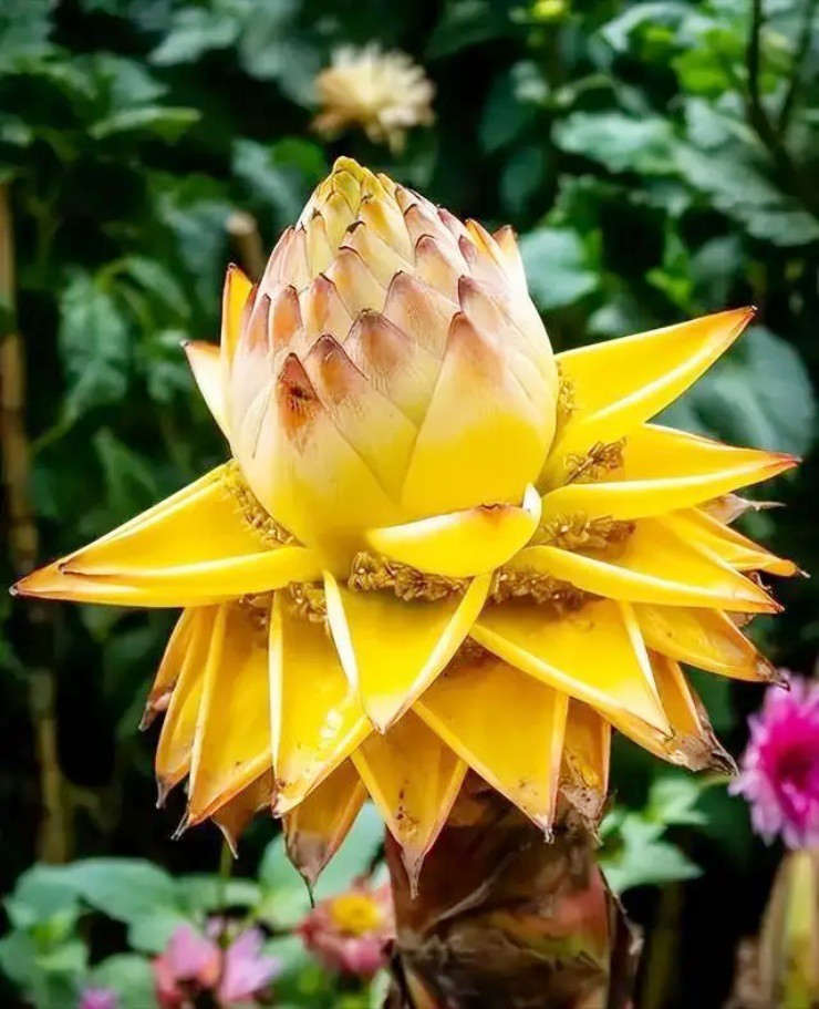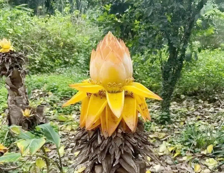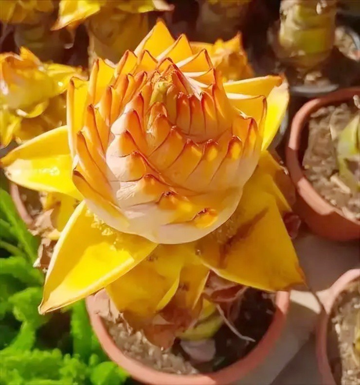 Đừng nhầm đây là hoa sen hay hoa súng, “bông sen vàng” này thực chất là cây chuối tài lộc (hay còn gọi là chuối sen vàng, chuối lùn Trung Quốc).