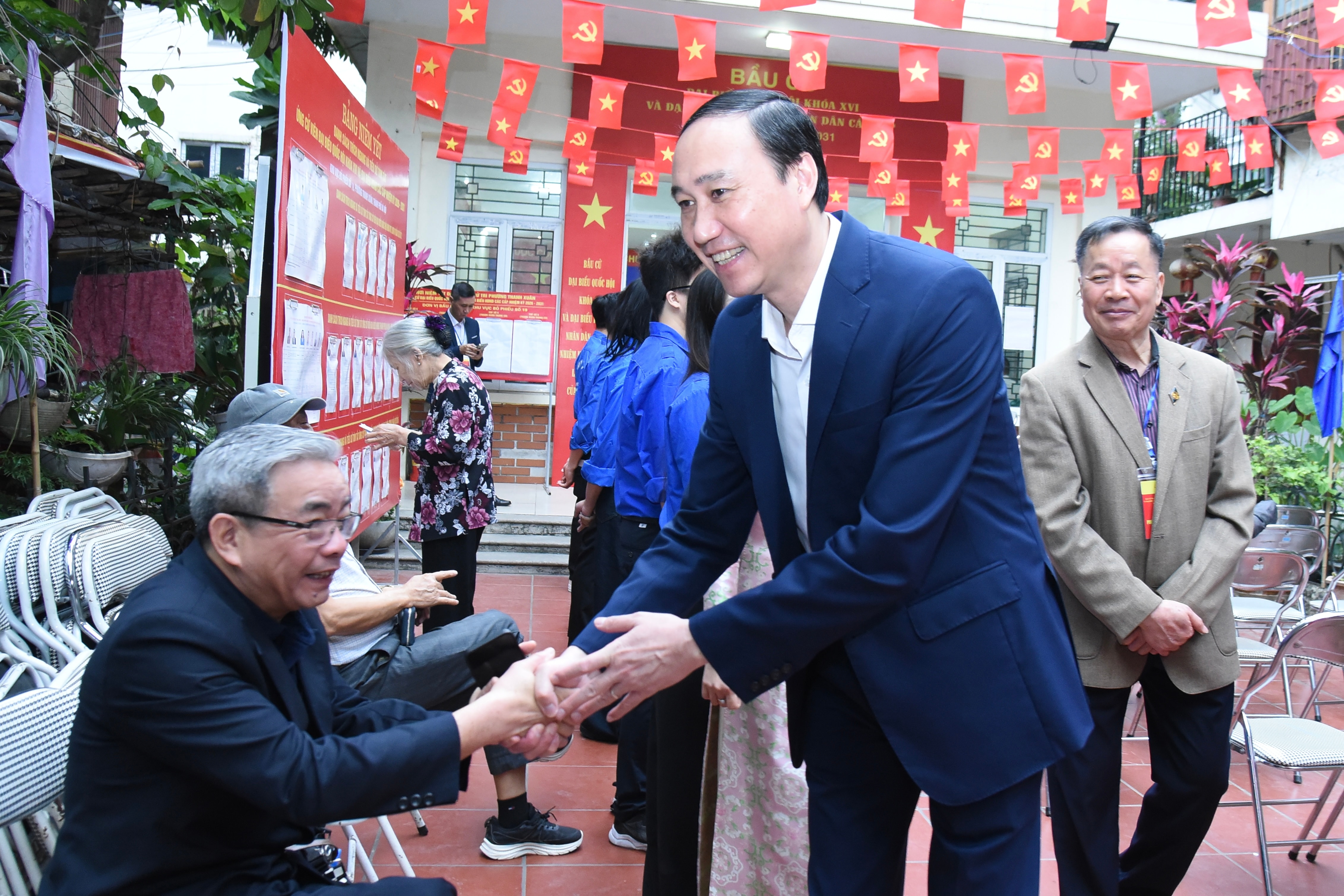 Tại khu vực bỏ phiếu số 19, phường Thanh Xuân, lực lượng đoàn viên, thanh niên tình nguyện tích cực tham gia hỗ trợ, hướng dẫn người cao tuổi trong quá trình thực hiện quyền bầu cử.