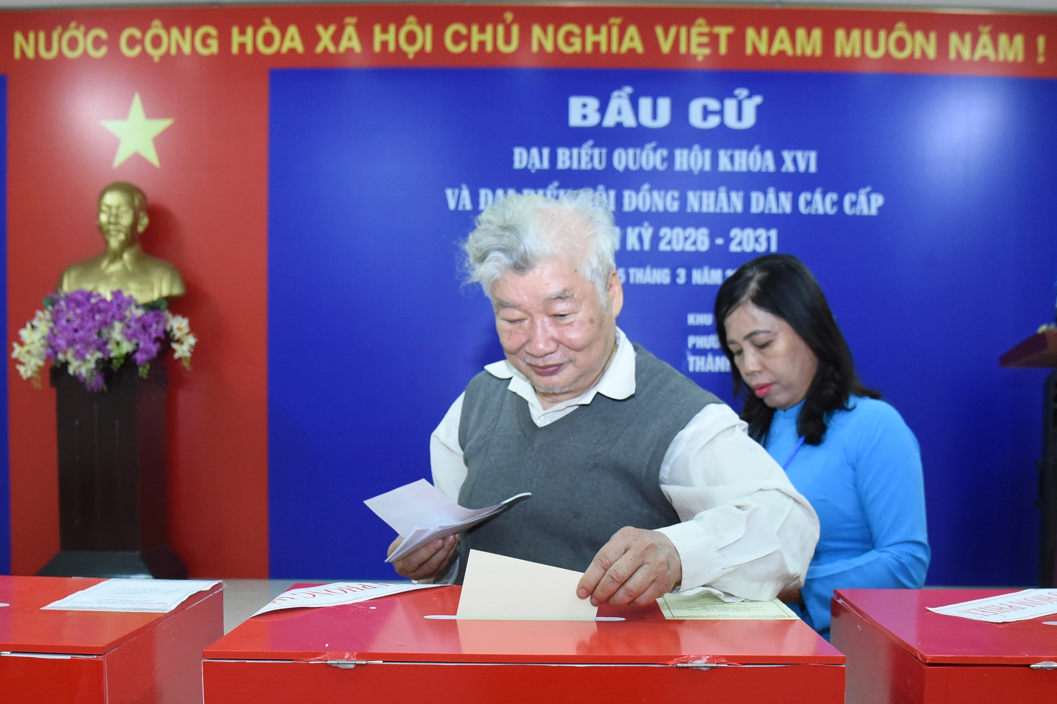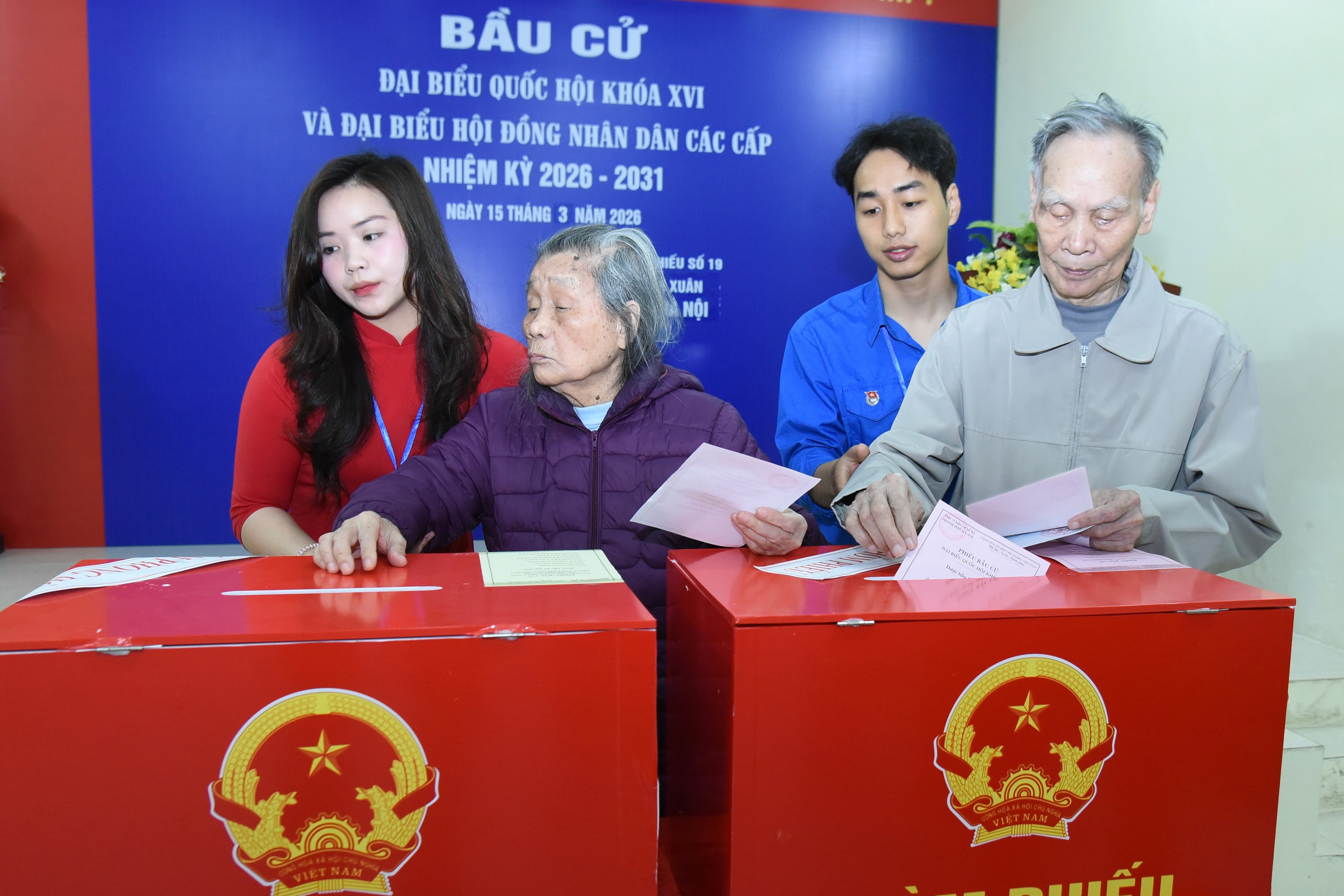 Cụ ông Nguyễn Công Ngô và vợ là cụ bà Nguyễn Thị Thoa, cùng 93 tuổi đã đến điểm bỏ phiếu tại từ sớm để dự lễ khai mạc cuộc bầu cử ĐBQH khóa XVI và đại biểu HĐND các cấp nhiệm kỳ 2026 - 2031, sau đó tham gia bỏ phiếu.
