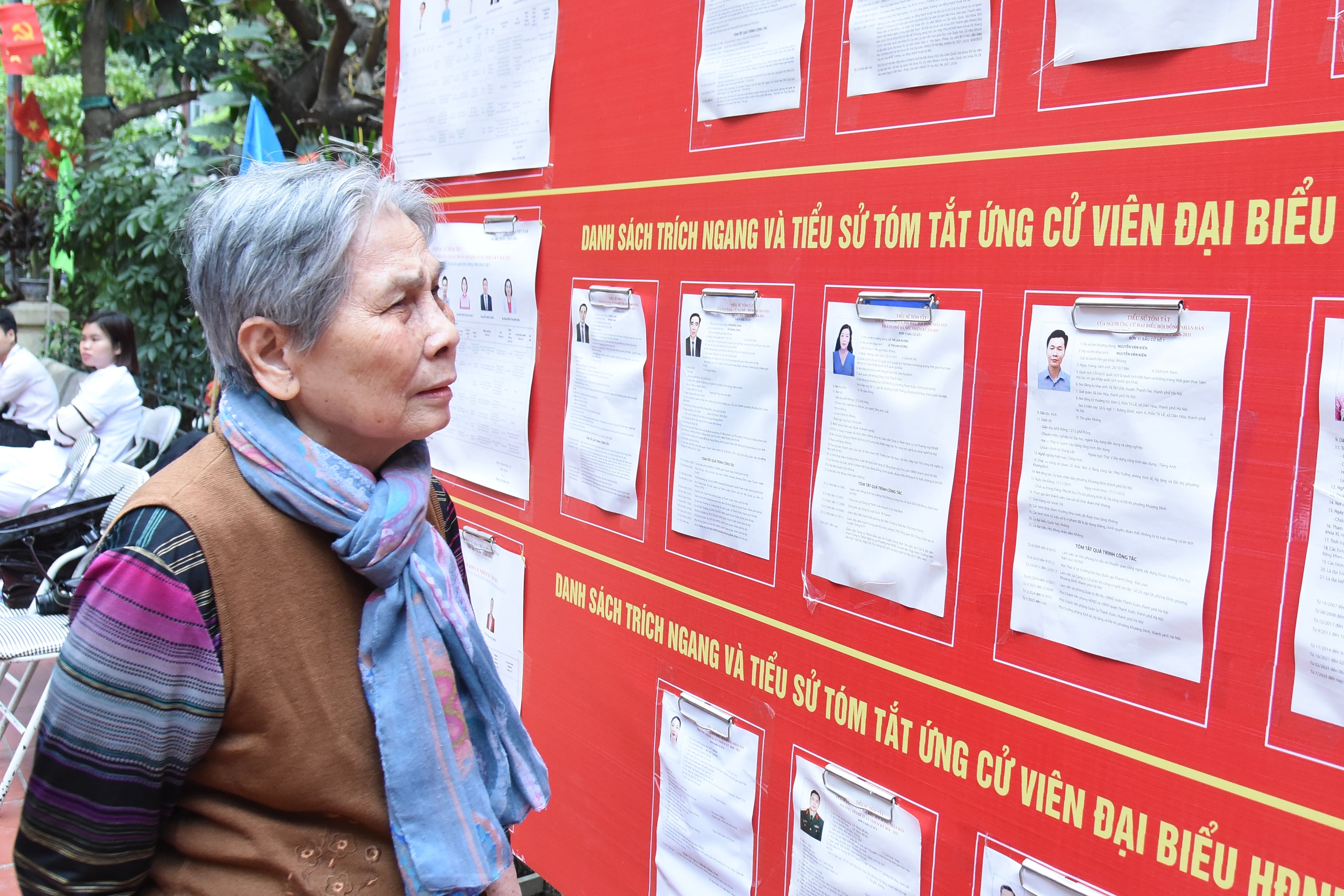 Cụ bà Phạm Thị Mộc, 87 tuổi theo dõi thông tin các ứng cử viên. Ảnh: Xuân Quý