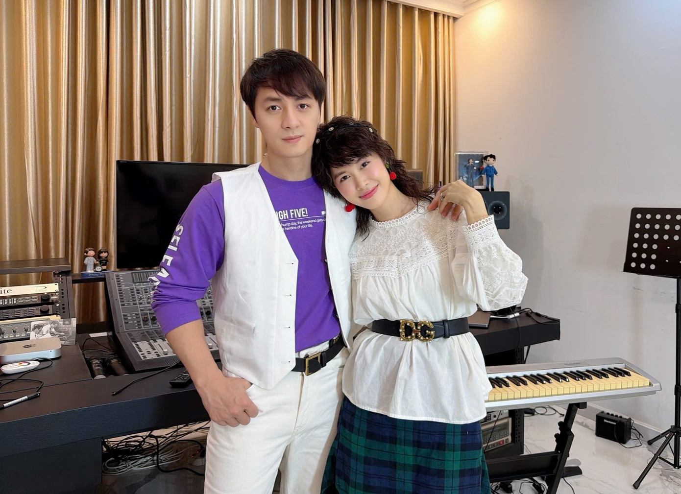 Điểm nhấn đặc biệt của bộ ảnh là khoảnh khắc cả hai cosplay chính mình cách đây 20 năm trước, khi vừa quen nhau. Trong ảnh, Thủy Anh tái hiện kiểu tóc “sư tử” thịnh hành một thời, dùng thắt lưng to bản, kẹp tóc, khuyên tai sặc sỡ. Đăng Khôi và bà xã gần như không già đi so với 20 năm trước.