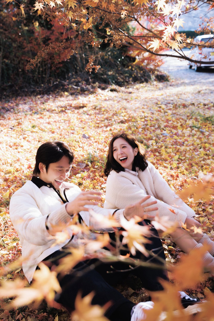 Giữa khung cảnh mùa thu Nhật Bản đẹp như tranh vẽ, Đình Tú và Ngọc Huyền xuất hiện đầy rạng rỡ trong khung hình. Trong loạt ảnh ở rừng phong, nam diễn viên ôm vợ từ phía sau, còn Ngọc Huyền mỉm cười hạnh phúc, đôi mắt khép nhẹ như để cảm nhận trọn vẹn khoảnh khắc ngọt ngào. Từng chiếc lá đỏ - vàng rơi nhẹ xung quanh càng làm bức hình mang màu sắc lãng mạn.