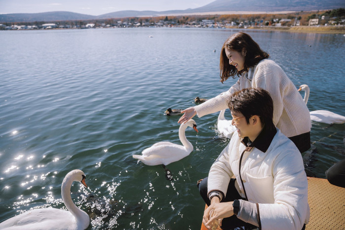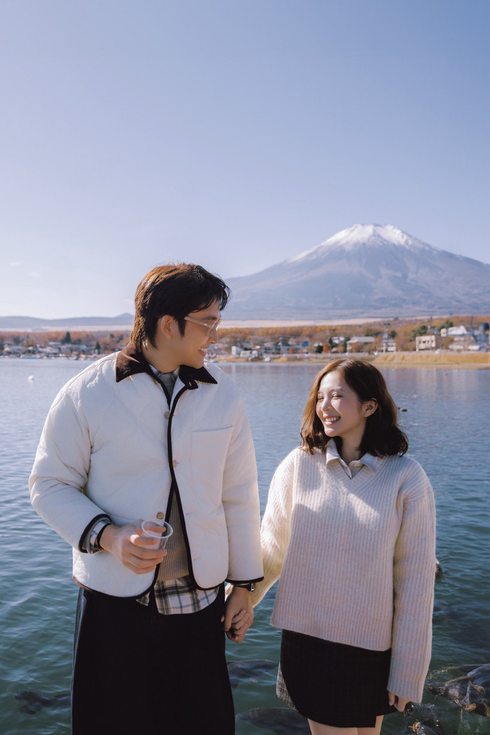 Ở những khoảnh khắc khác, cả hai đứng cạnh hồ nước trong vắt, phía sau là ngọn núi Phú Sĩ hùng vĩ. Đình Tú ngắm vợ với ánh mắt ấm áp, còn Ngọc Huyền đáp lại bằng nụ cười rạng rỡ. Chỉ với ánh nhìn và loạt cử chỉ tình cảm cũng đủ cho thấy họ đang tận hưởng khoảng thời gian hạnh phúc và thoải mái nhất sau đám cưới.
