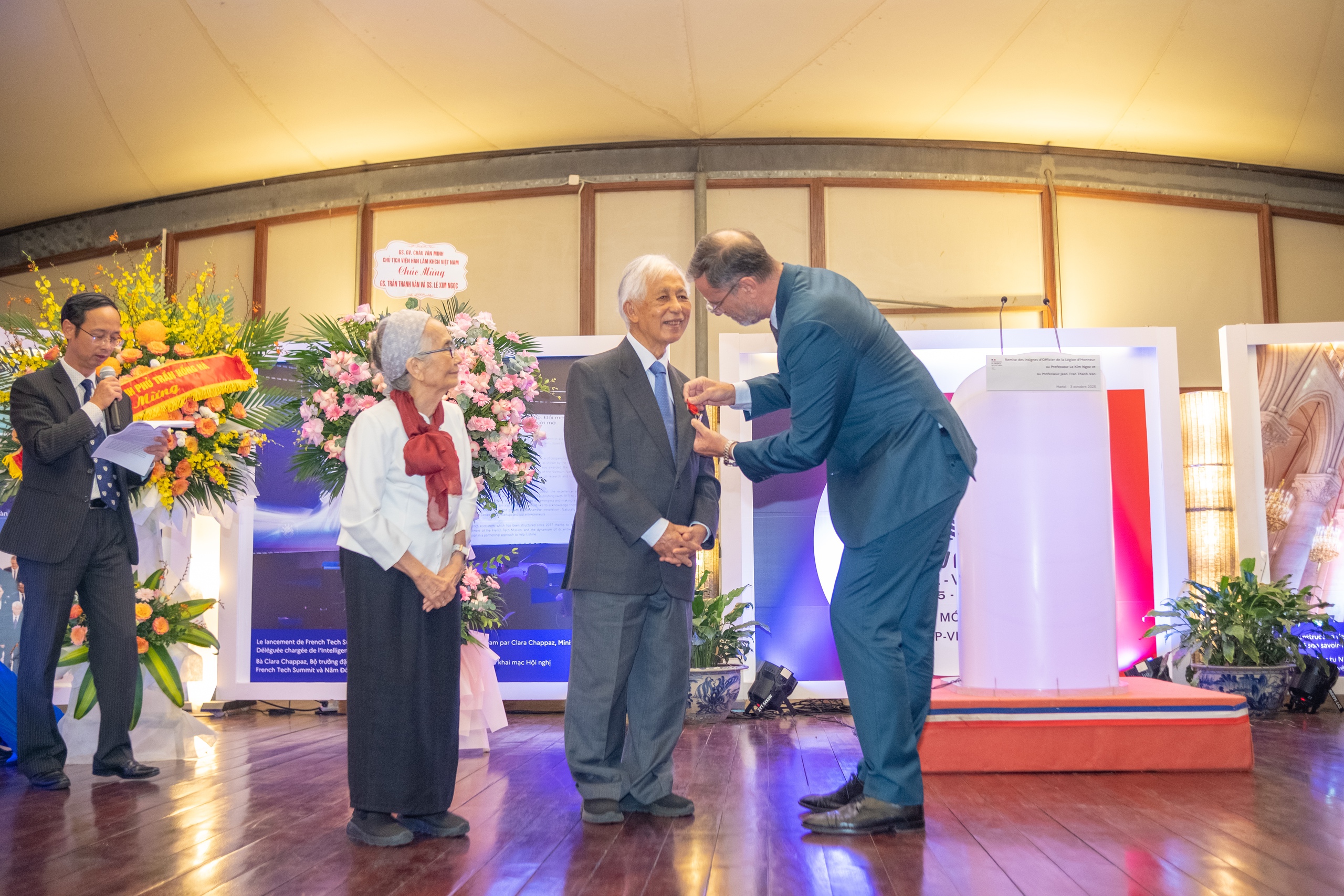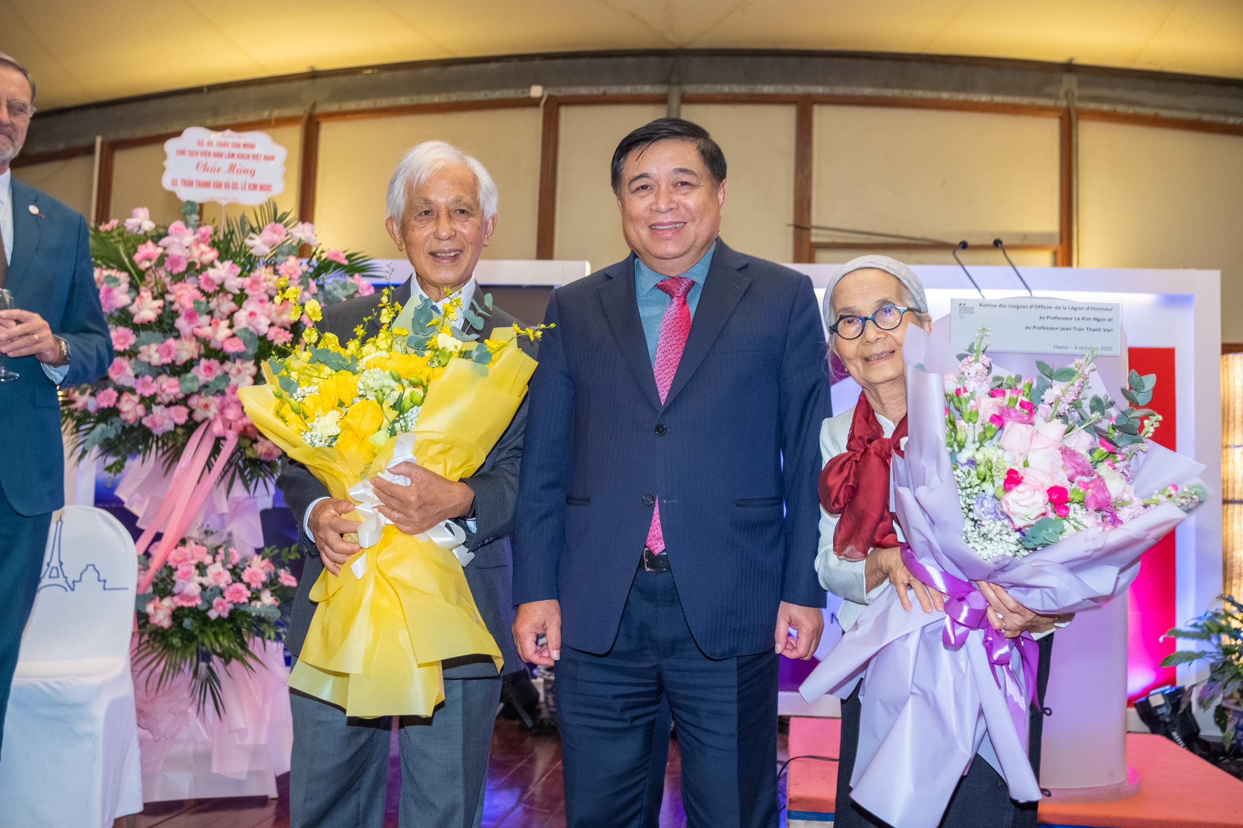 Đại sứ Pháp Olivier Brochet trao huân chương cho GS. Trần Thanh Vân - Chủ tịch Hội Khoa học Gặp gỡ Việt Nam, Giám đốc Trung tâm Quốc tế Khoa học và Giáo dục liên ngành (ICISE), và GS. Lê Kim Ngọc - Chủ tịch Hội bảo trợ trẻ em Việt Nam tại Pháp.