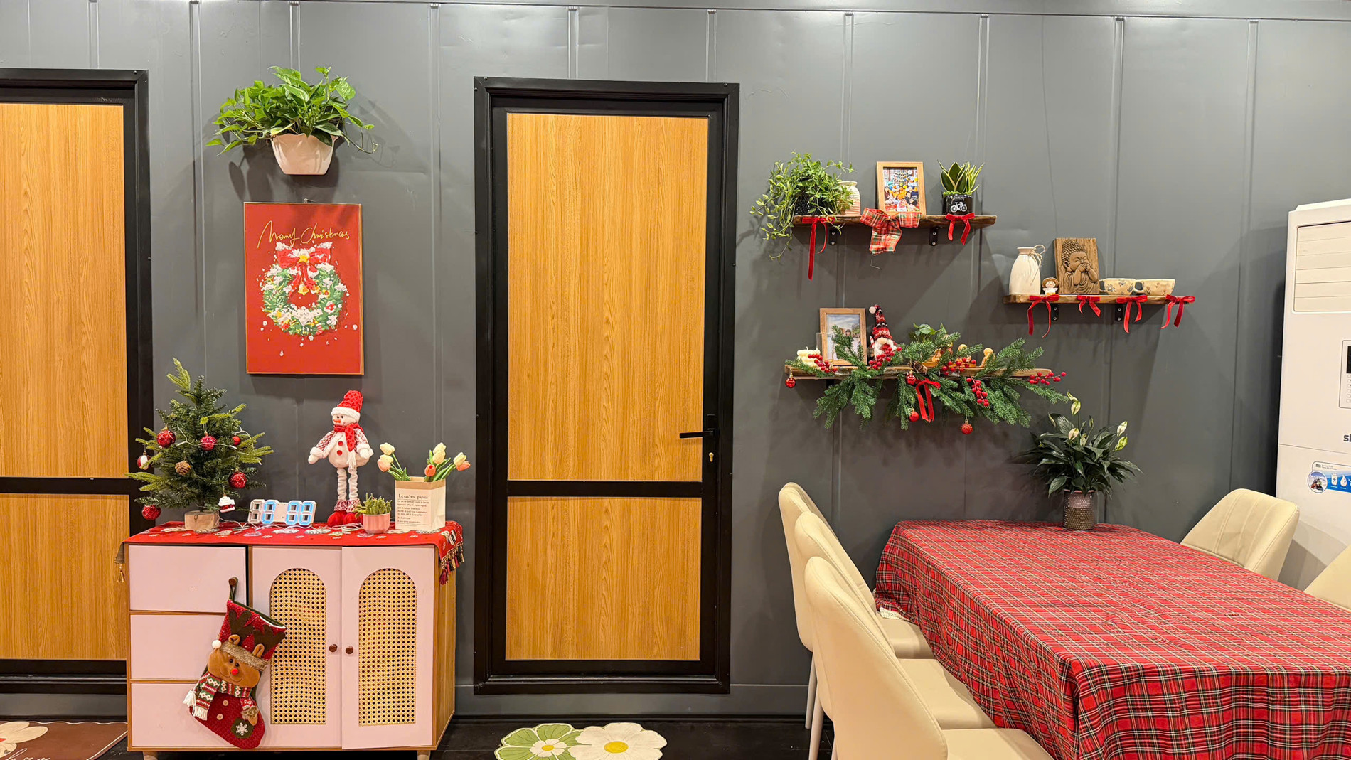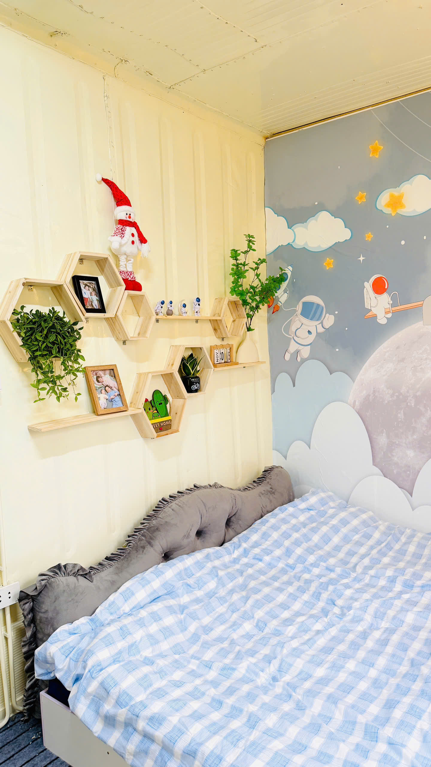 Phần tường được giữ nguyên bản từ container. Chị Linh dán giấy, tranh và gắn thêm kệ gỗ để tăng tính thẩm mỹ cho không gian sống