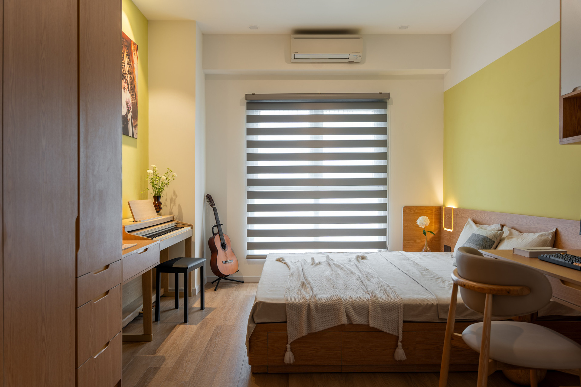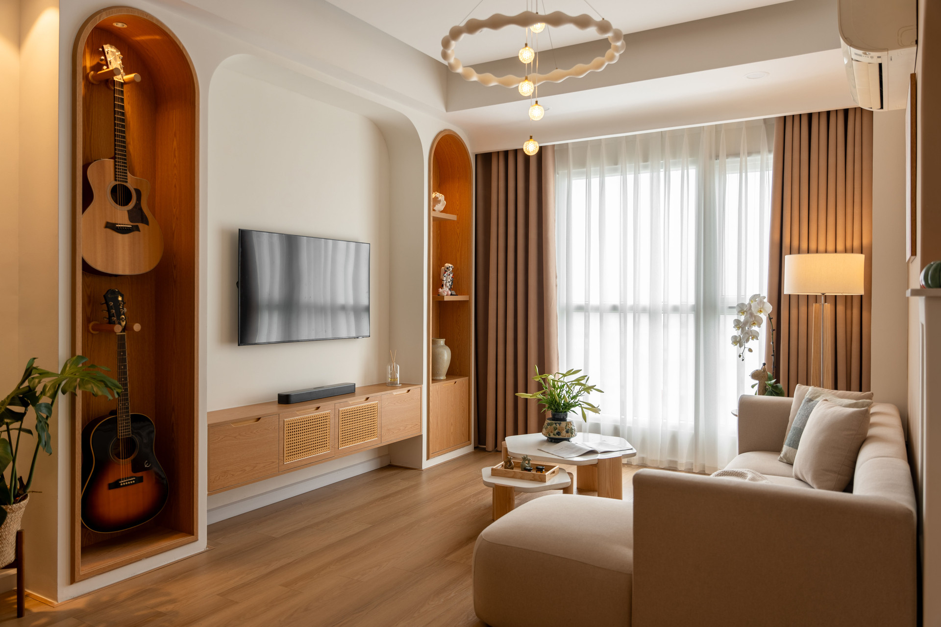 Nội thất được lựa chọn màu sắc chủ đạo trung tính, dịu nhẹ. Phòng khách tràn ngập ánh sáng tự nhiên. Đội ngũ thiết kế cũng kết hợp khéo léo các kệ trưng bày guitar - nhạc cụ gia chủ yêu thích sưu tầm, tạo tính cá nhân hóa cho căn hộ