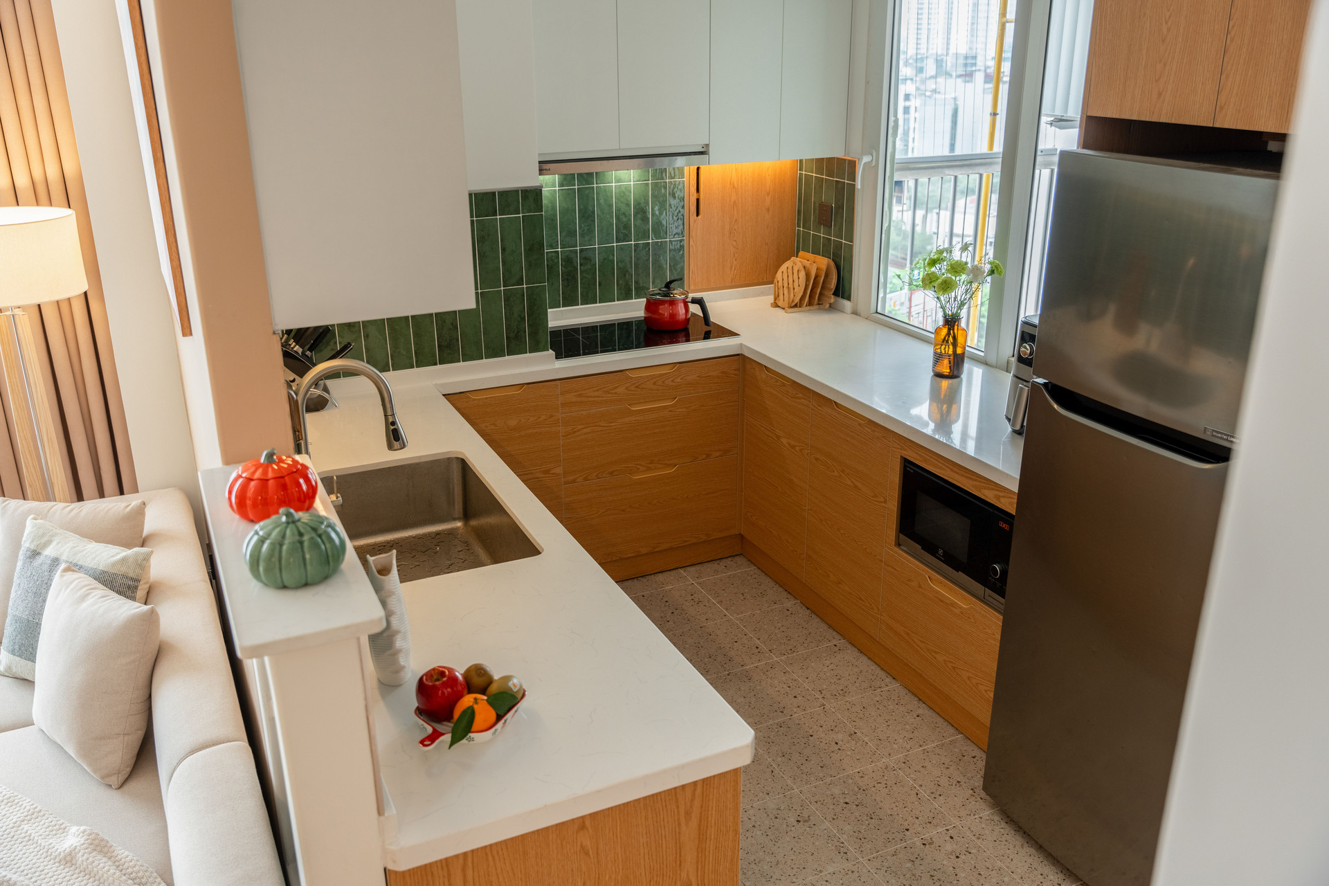 Không gian sinh hoạt chung gồm phòng bếp - phòng khách - phòng ăn được thiết kế liên thông, không sử dụng vách ngăn để tạo cảm giác thoáng đãng, rộng rãi