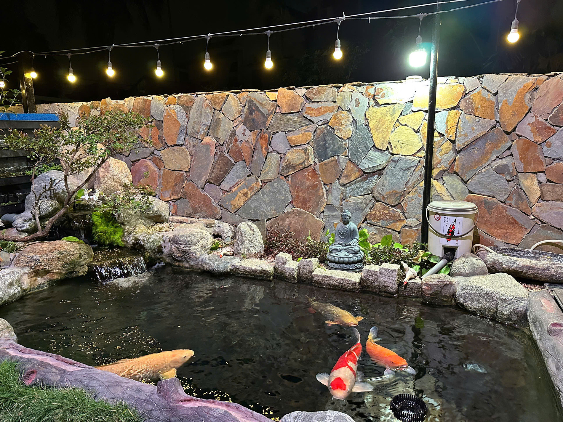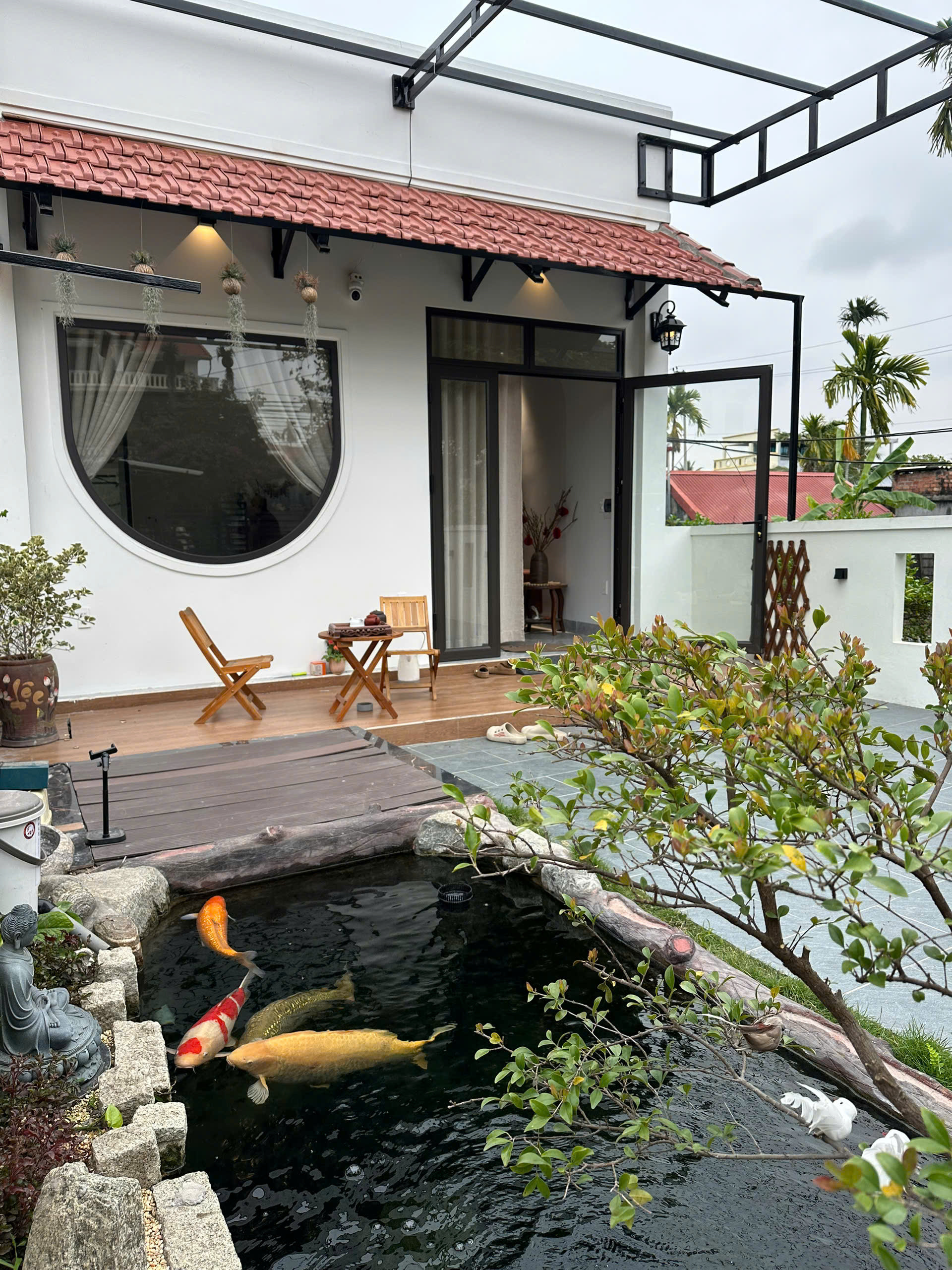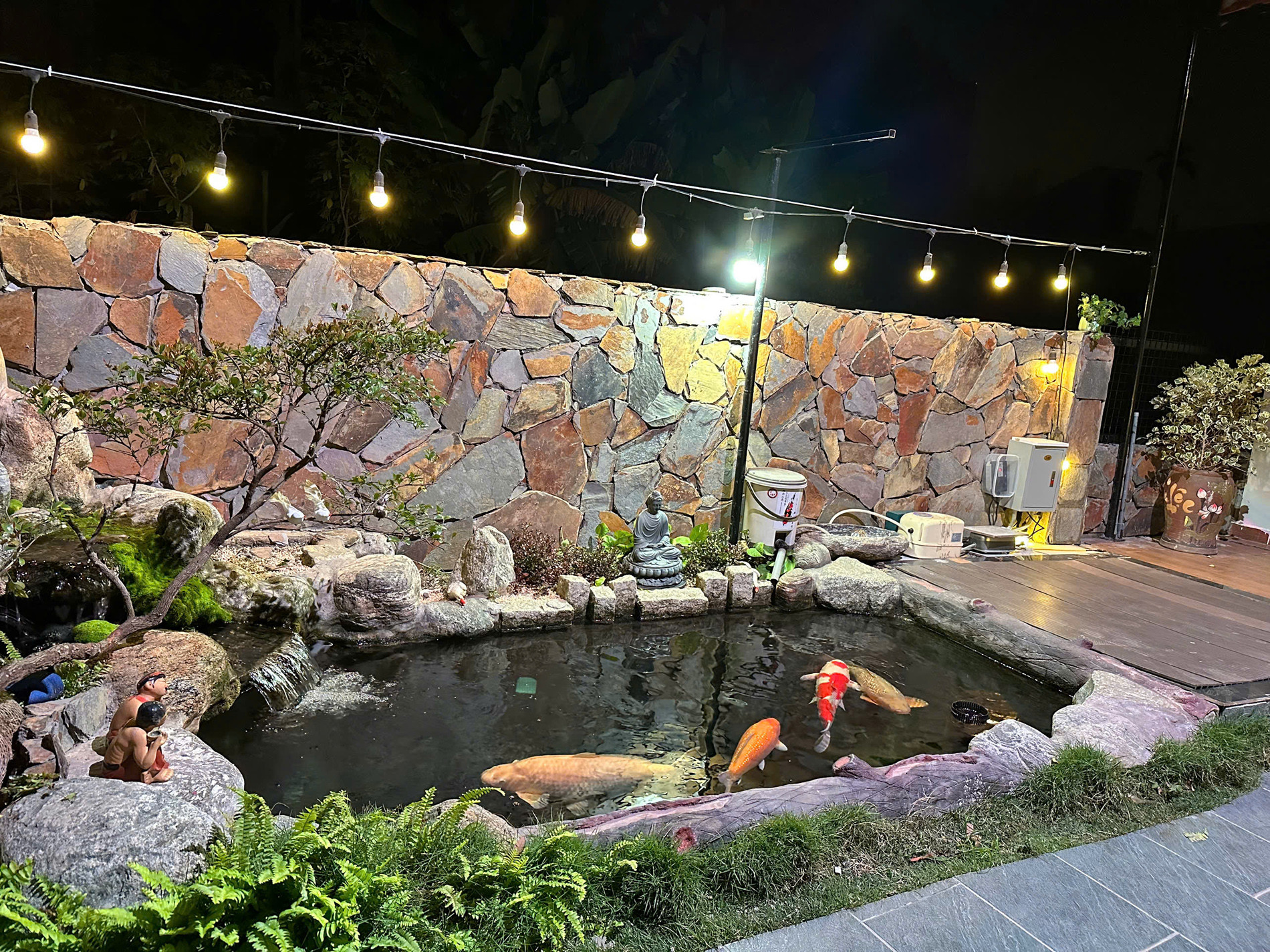Khoảng sân với hồ cá trở thành góc thư giãn yêu thích của gia đình anh Hải và bạn bè khi ghé chơi