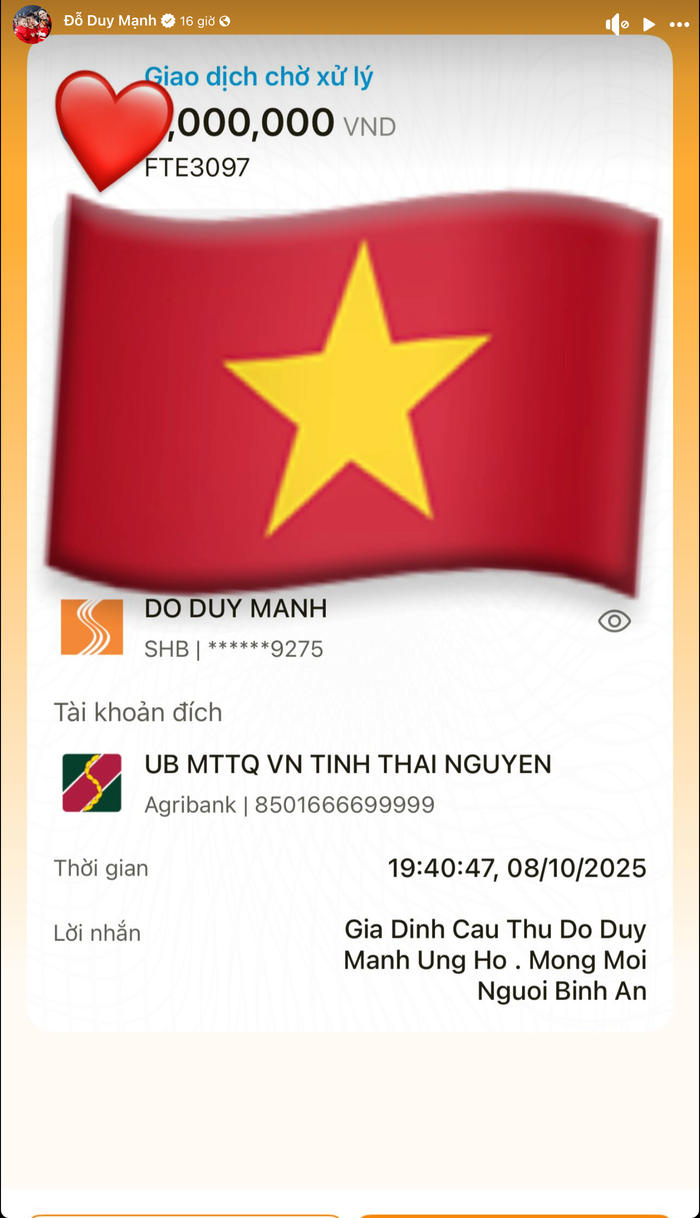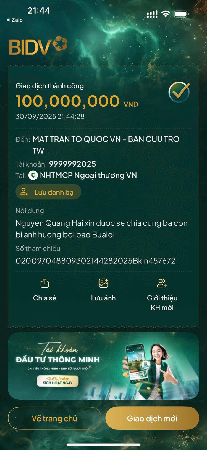 Có thể thấy, 200 triệu đồng không chỉ là con số, mà là biểu tượng của tình người, của sự đoàn kết giữa lúc thiên tai hoành hành. Và chính những hành động đẹp như thế đã khiến người hâm mộ thêm yêu mến, tự hào về thế hệ cầu thủ trẻ, những người biết sống tử tế, biết lan tỏa yêu thương giữa cuộc đời.