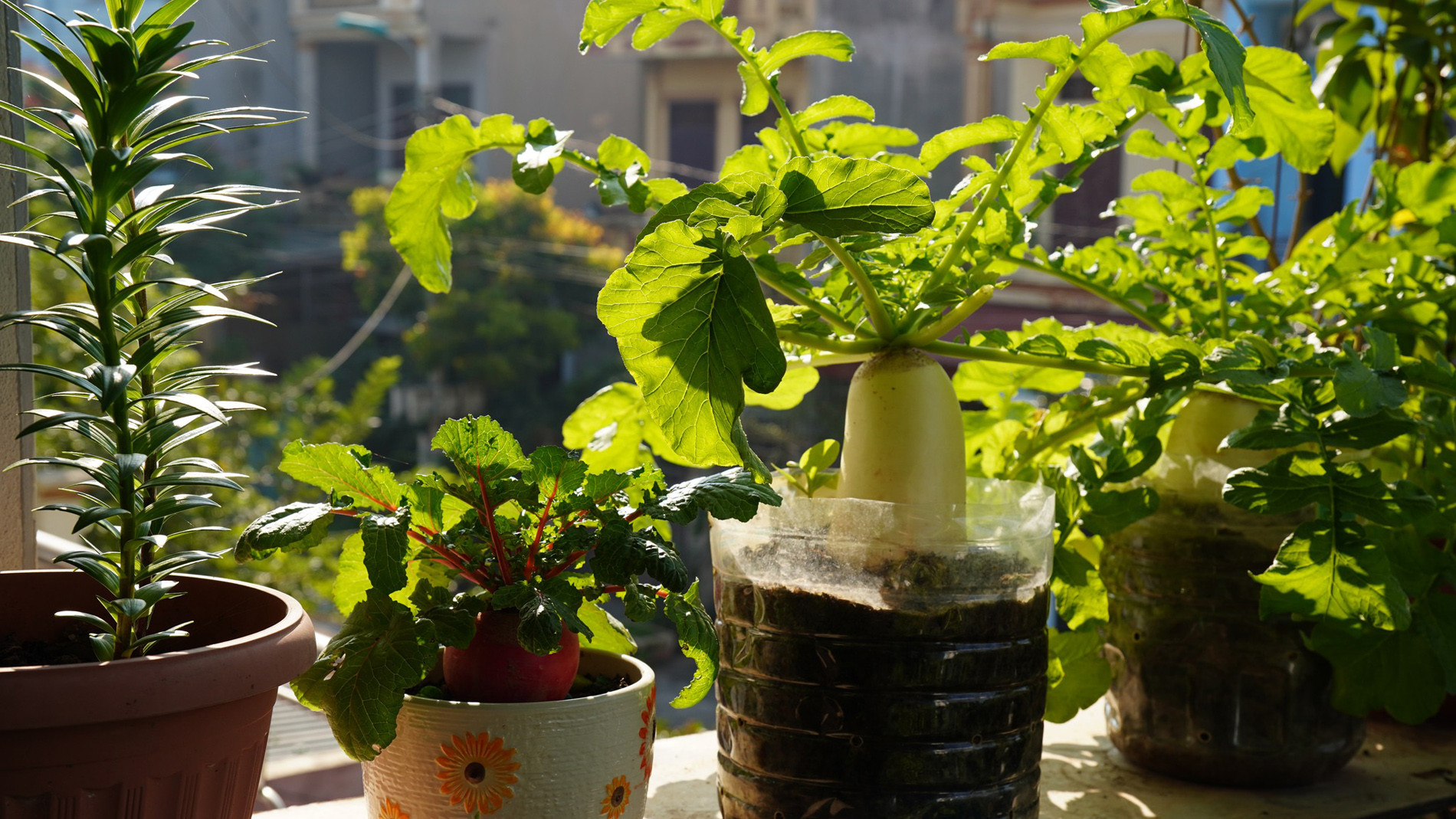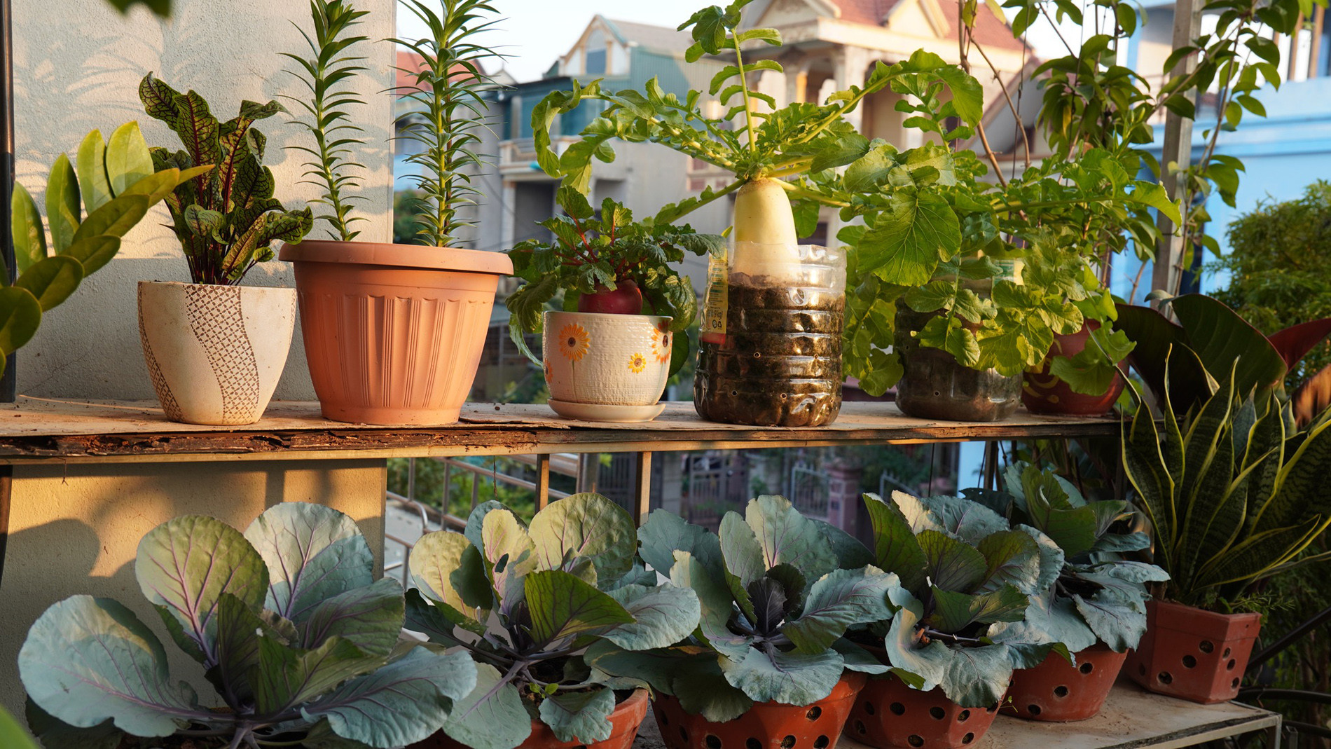 Gia chủ tận dụng đồ cũ như thùng sơn, can nước, thùng xốp, chai nhựa… để làm chậu trồng, vừa tối ưu, tiết kiệm chi phí lại góp phần bảo vệ môi trường