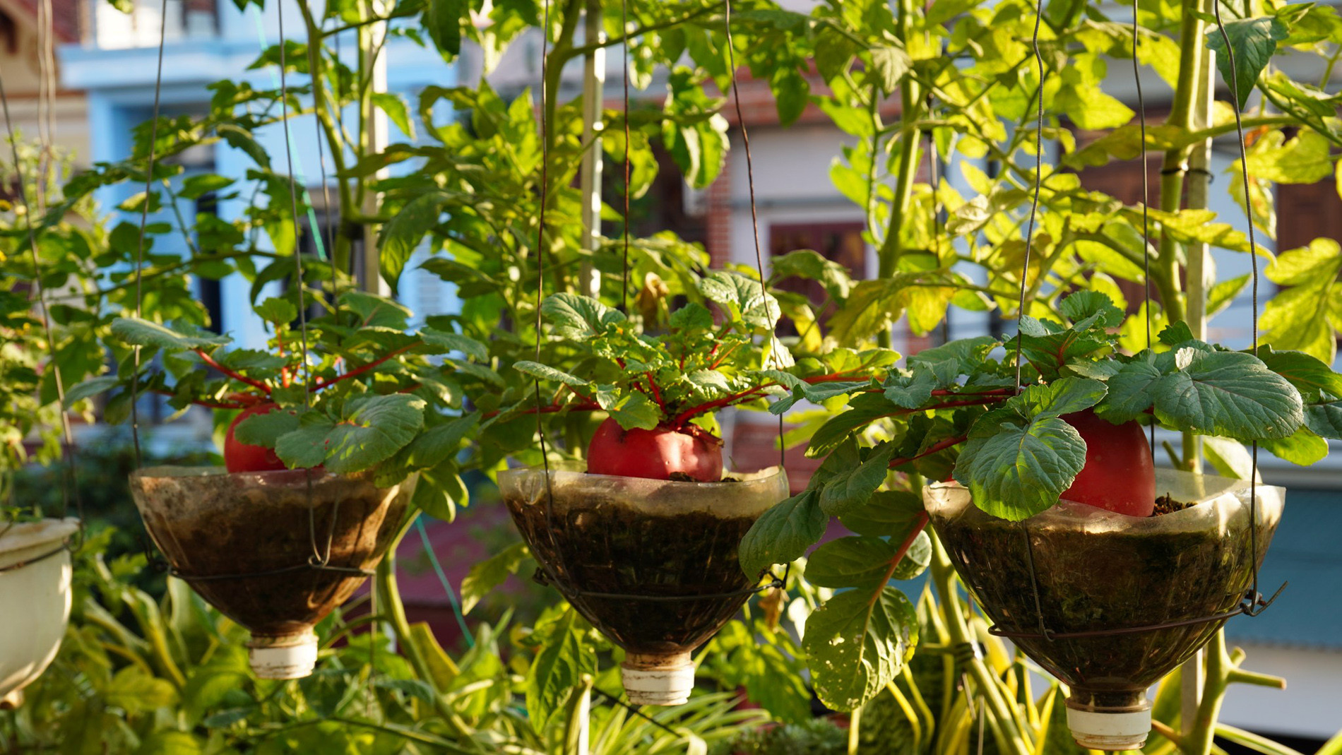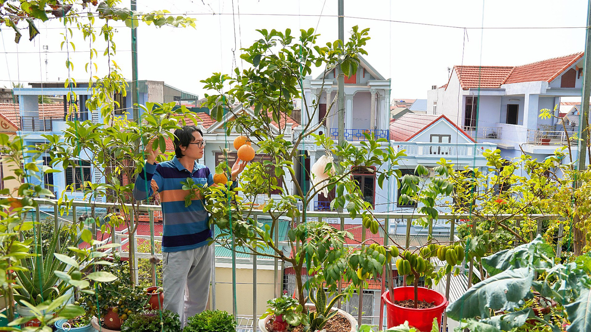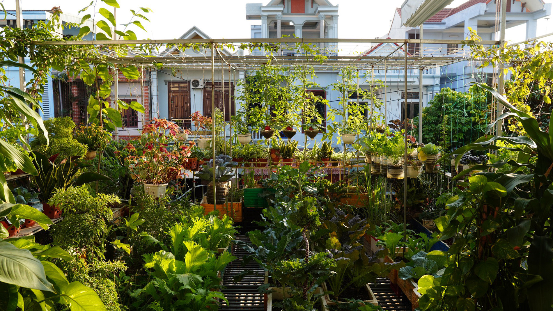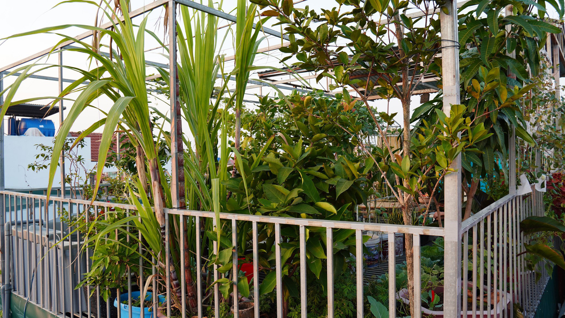 Khu vườn trên cao được chăm sóc theo hướng bán hữu cơ, ưu tiên cung cấp nguồn rau, củ, quả sạch cho gia đình và phủ xanh ngôi nhà để điều hòa vi khí hậu