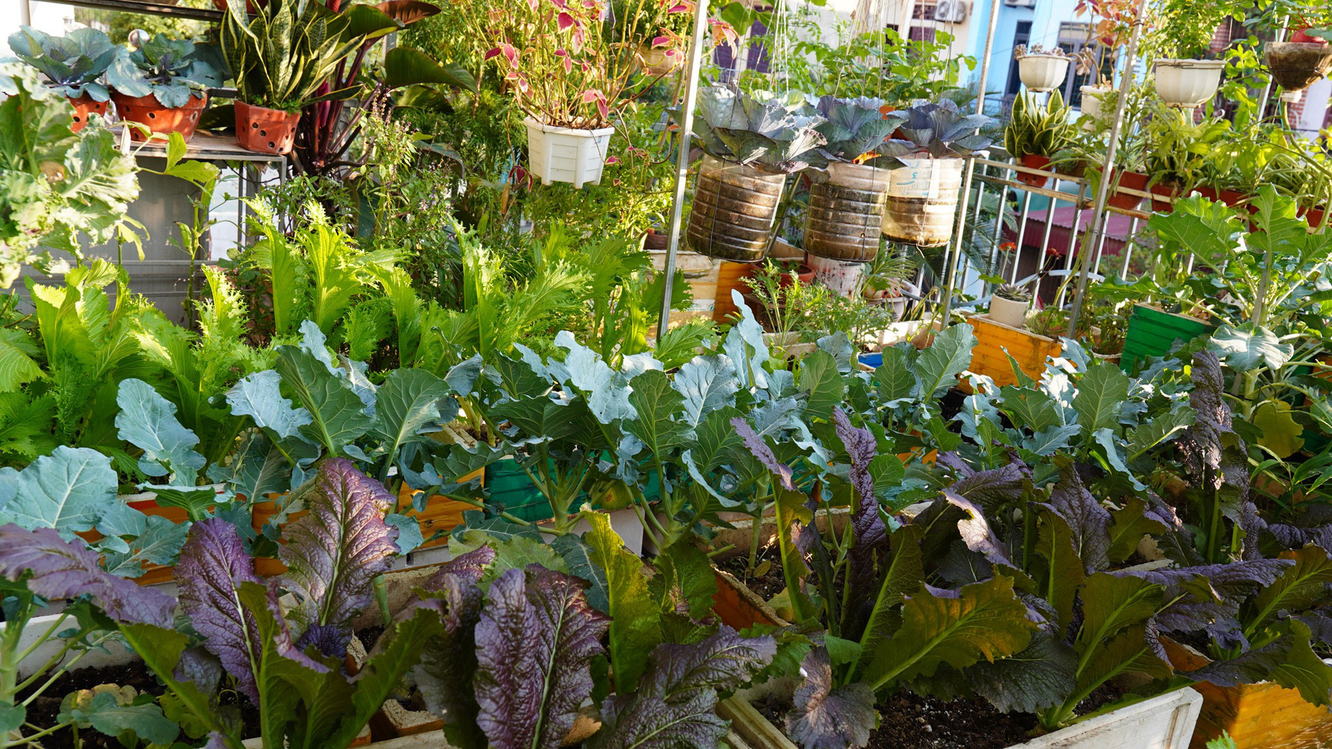 Họ tận dụng khoảng trống ở ban công tầng 2, 3 và sân thượng tầng 3 để làm vườn trên cao, vừa chủ động nguồn thực phẩm sạch hằng ngày, vừa có không gian sống xanh mát giữa lòng phố.