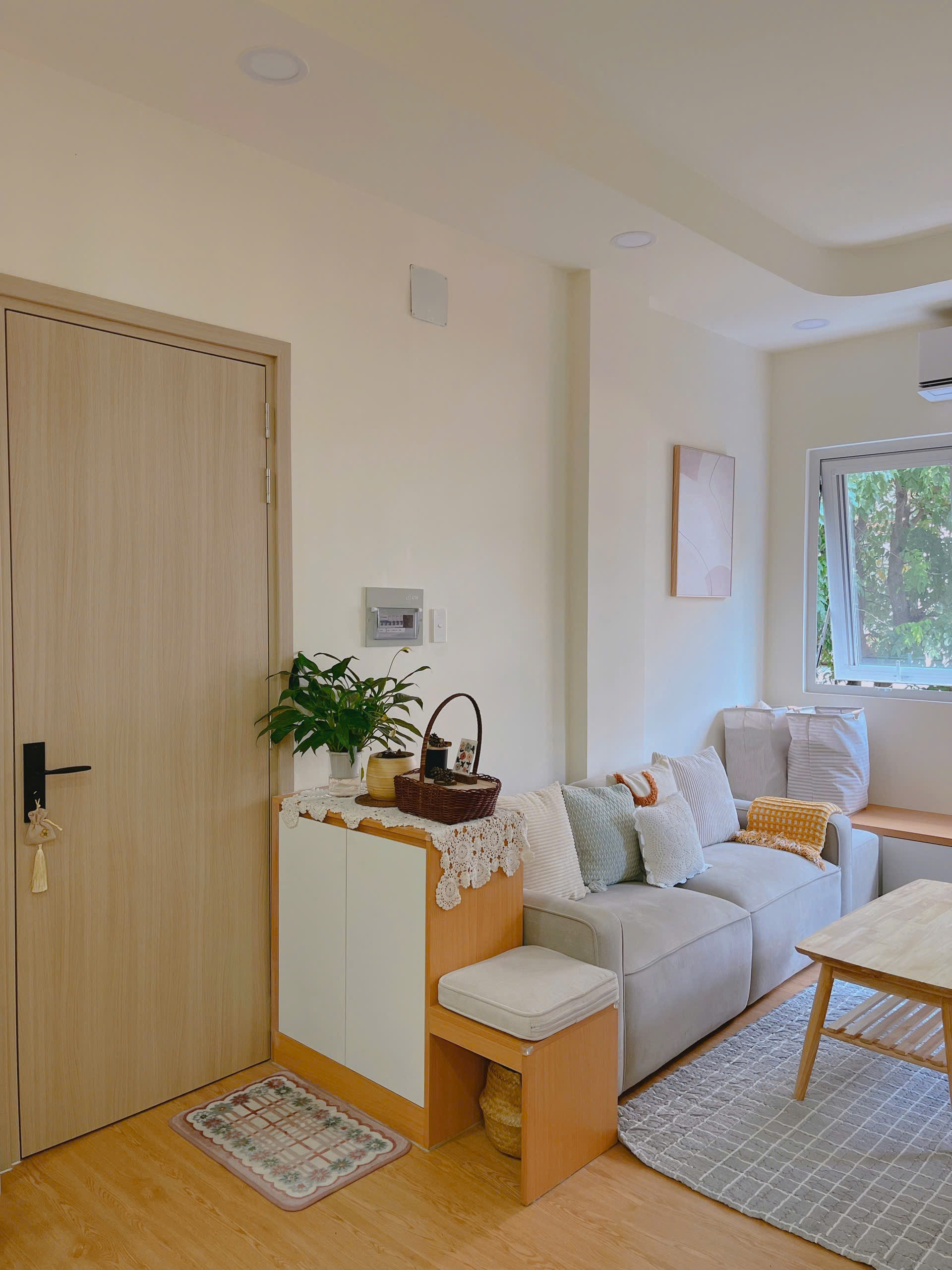 Để có không gian sống đầy đủ tiện nghi mà vẫn đảm bảo tính thẩm mỹ như mong muốn, anh chị chi khoảng 200 triệu đồng để sửa thô toàn bộ căn hộ, từ làm lại tường, sơn chống thấm, thay sàn cho đến đường điện nước.