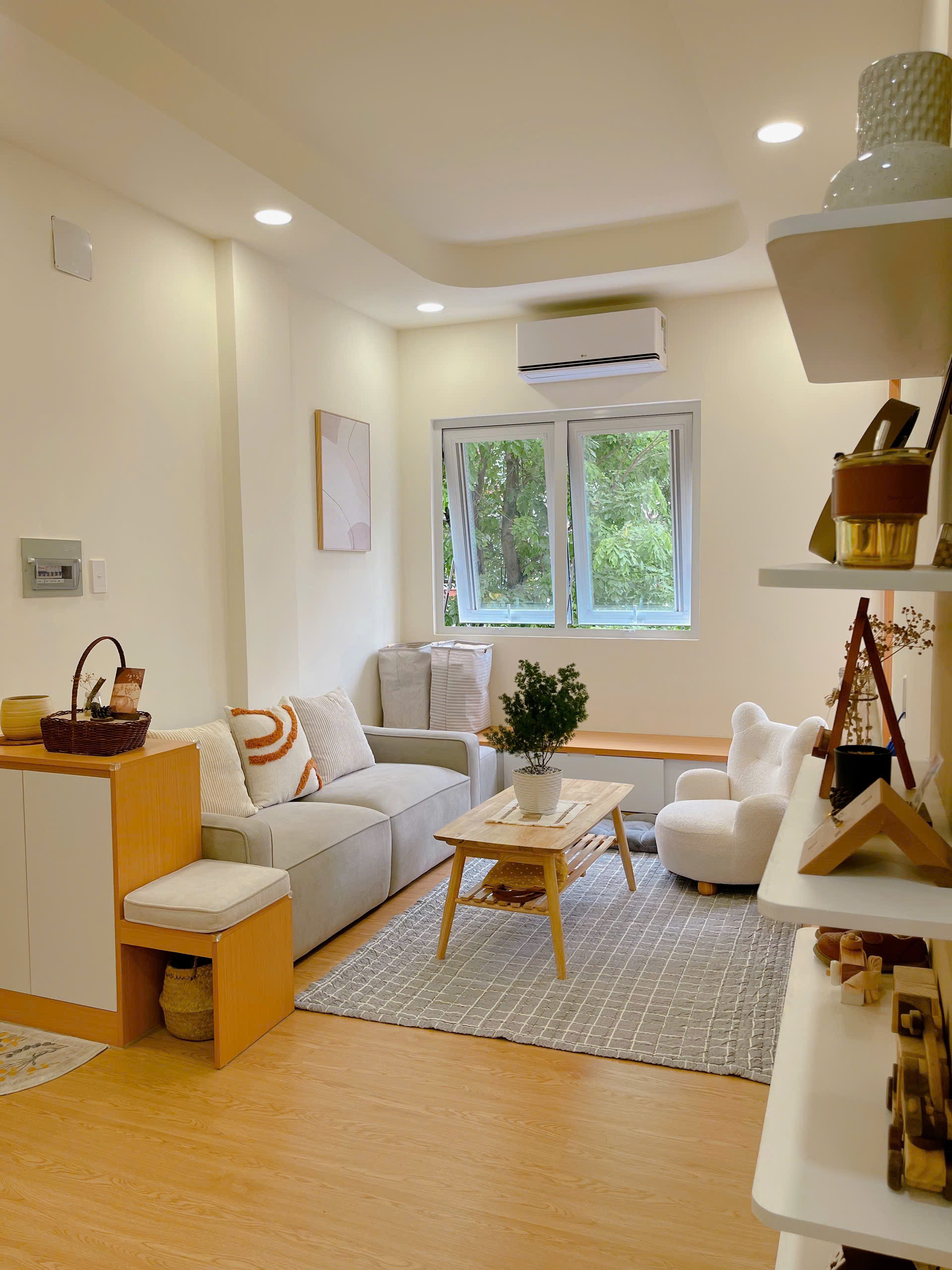 Nội thất được bài trí tối giản với chất liệu gỗ chủ đạo, tông màu nâu sáng kết hợp trắng, ghi, tạo cảm giác mới mẻ, thoáng sáng mà vẫn ấm cúng, gần gũi.