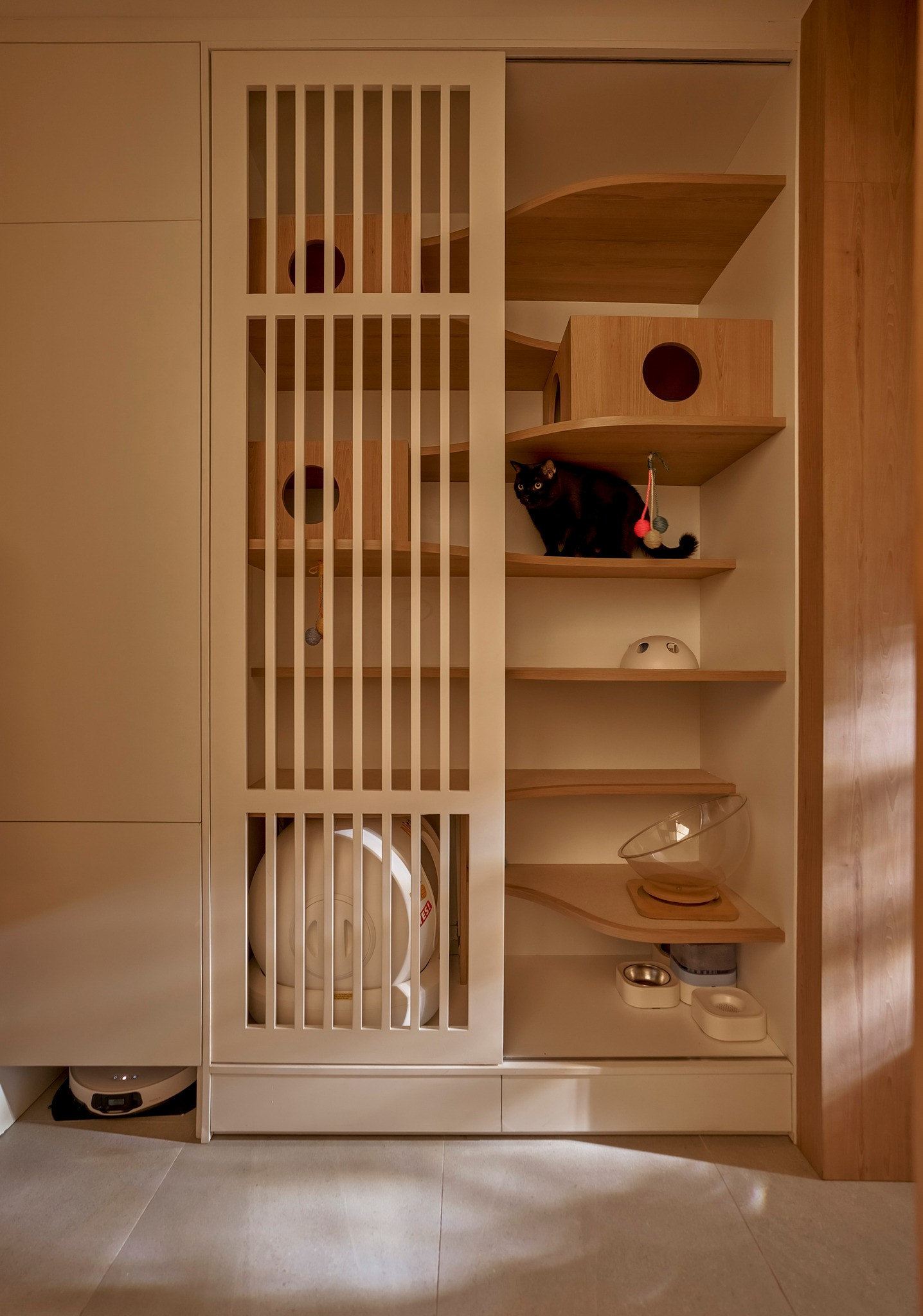 Chị Trầm cũng thiết kế những "ốc đảo", hệ tủ dành riêng cho 2 chú mèo cưng vui chơi, ăn ngủ và vệ sinh